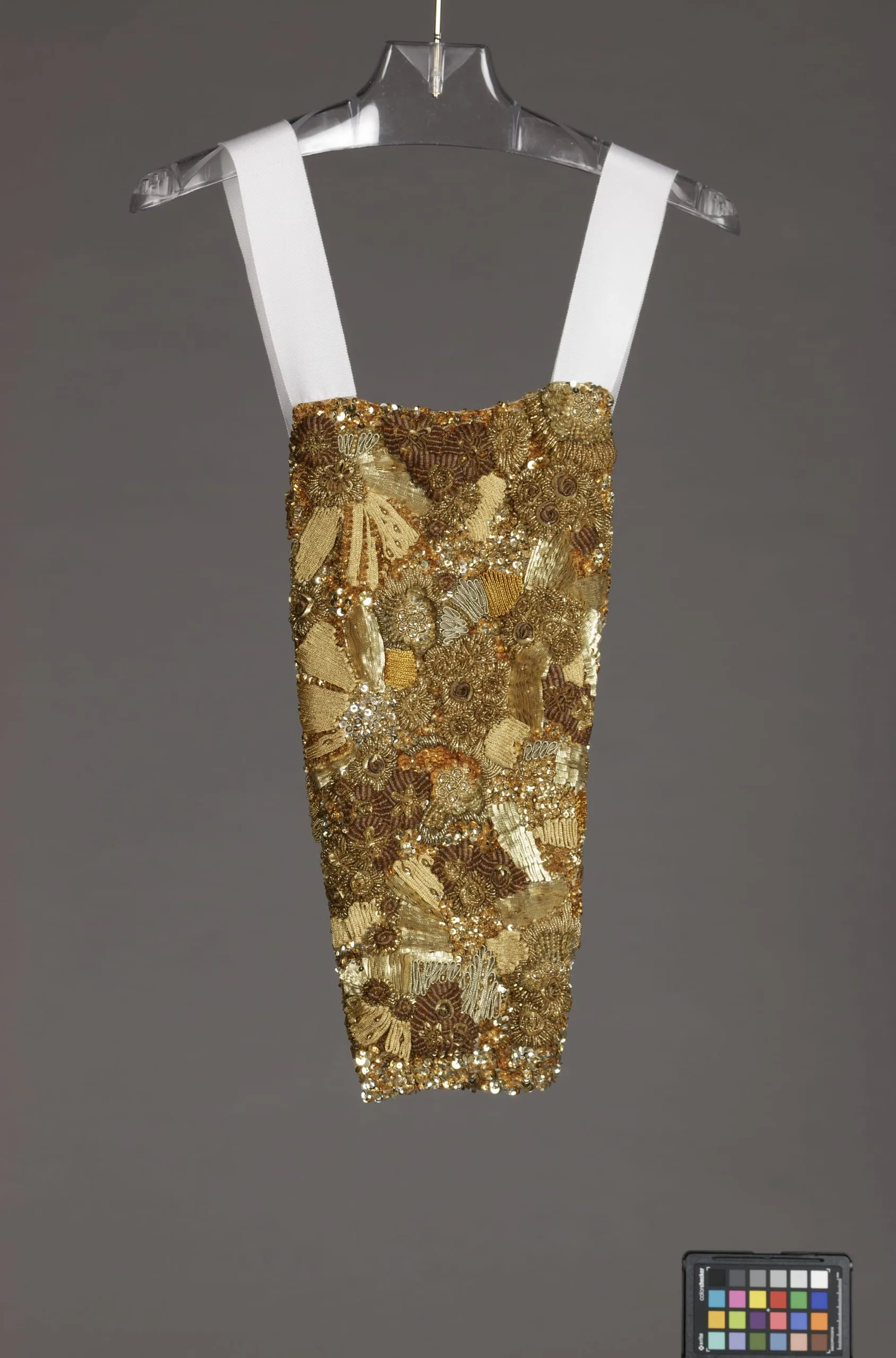 - Silk plain weave (crepe), with metallic ribbon, metallic thread, glass bead, and sequin embroidery