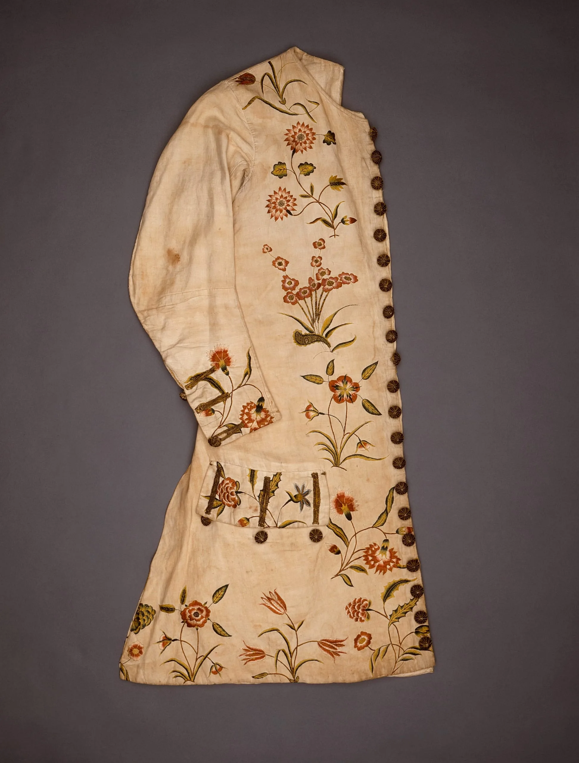 - Linen plain weave with silk and metallic-thread embroidery, and metallic-thread covered buttons