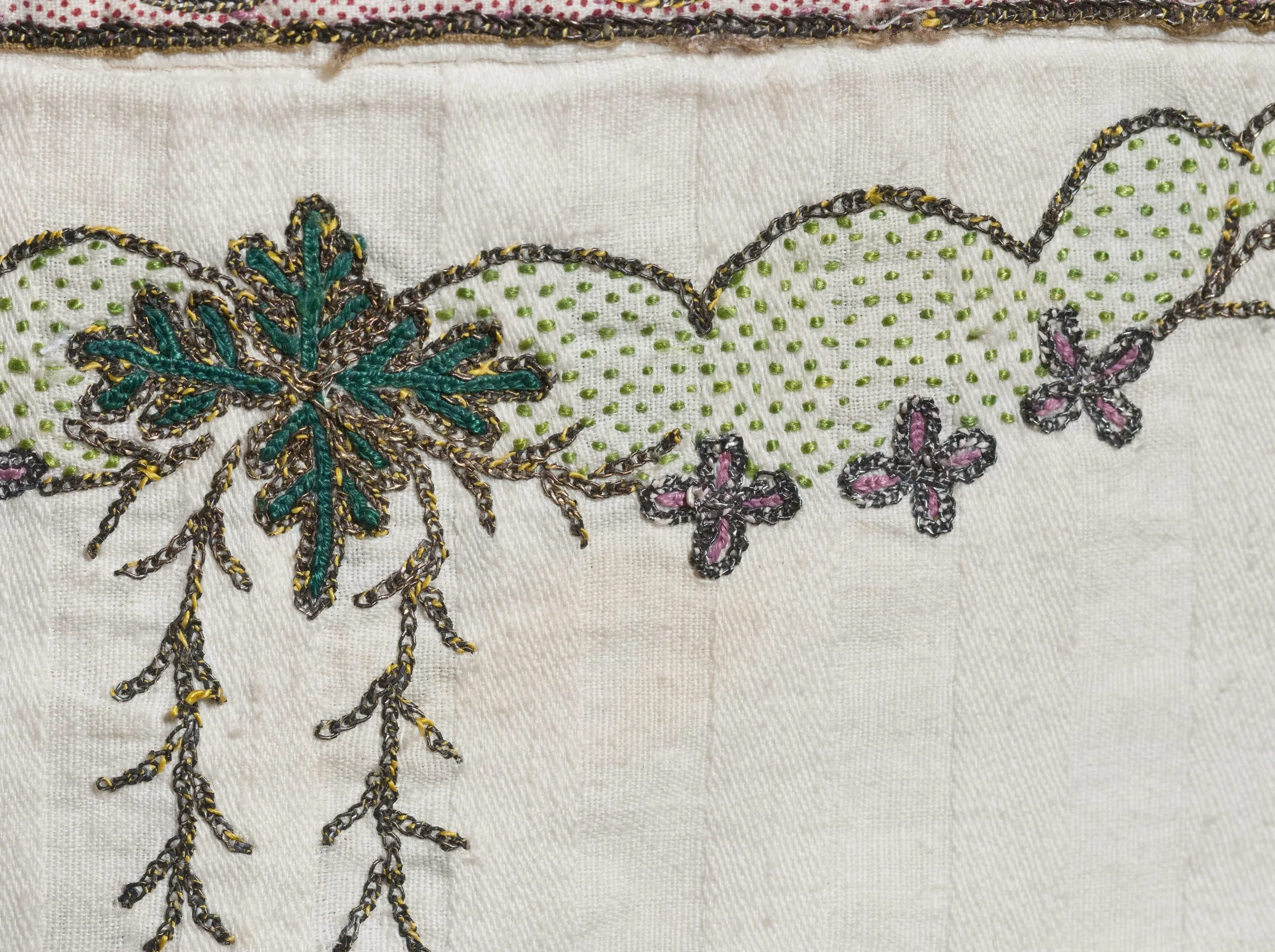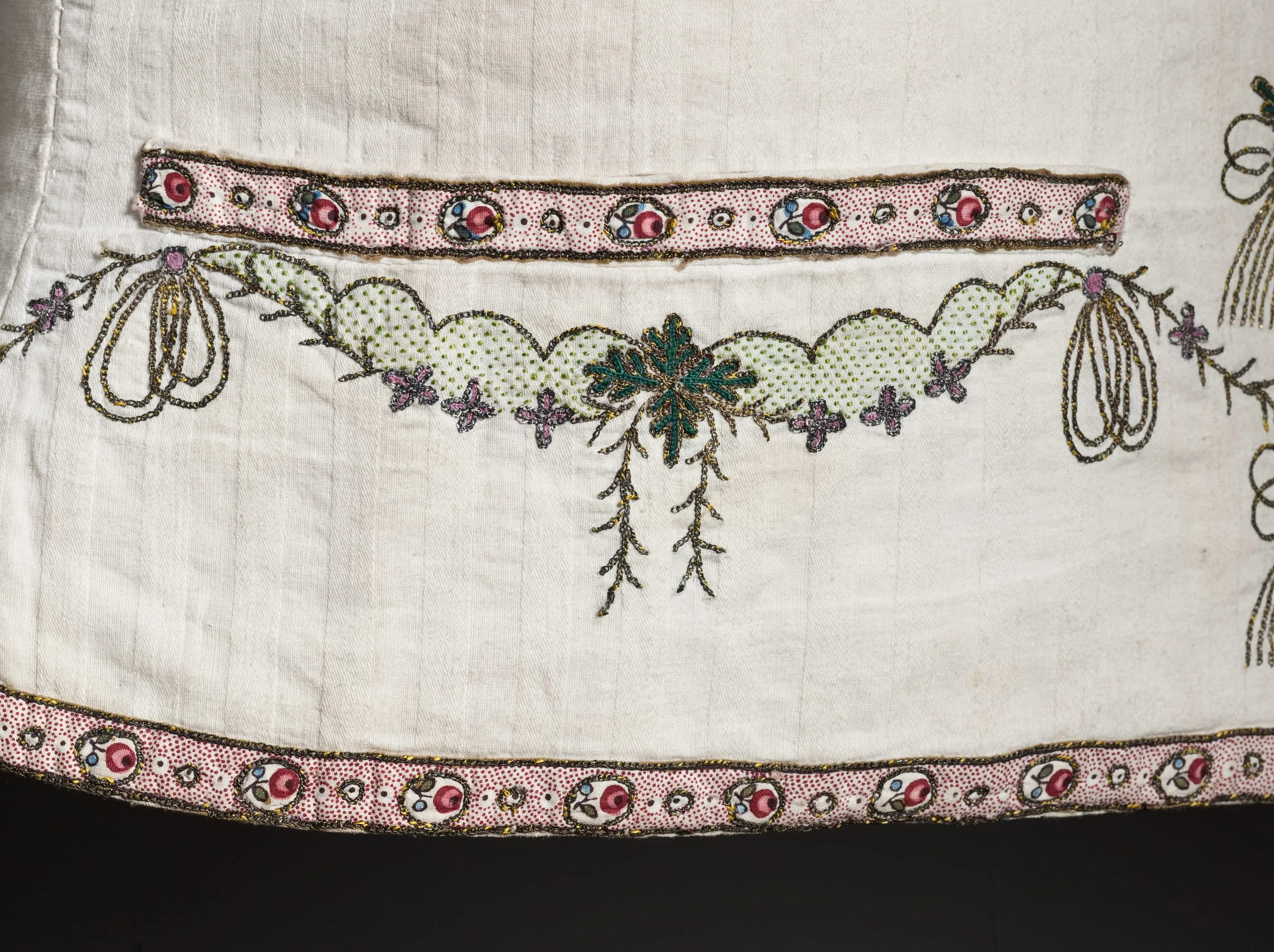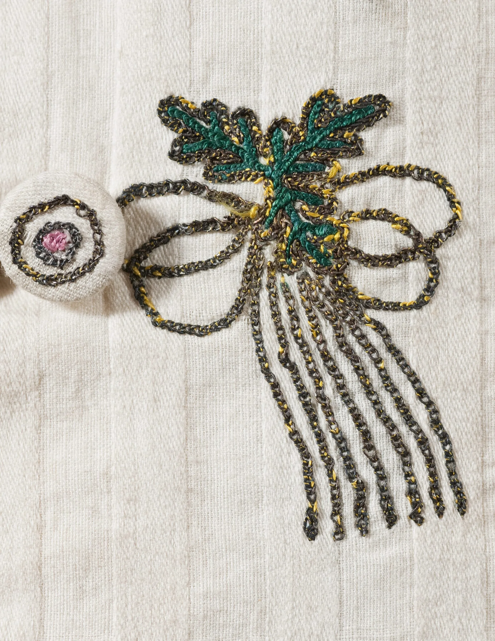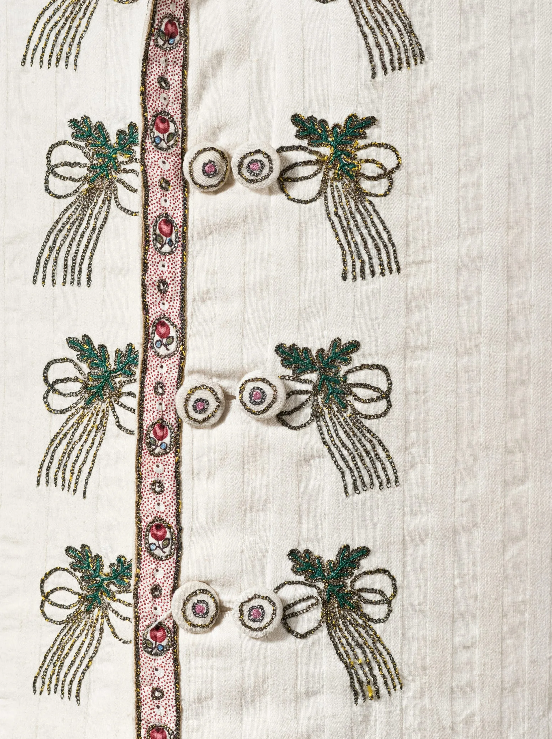 - Cotton plain weave and cotton twill with silk embroidery, metallic thread embroidery, and cotton plain weave trim, printed