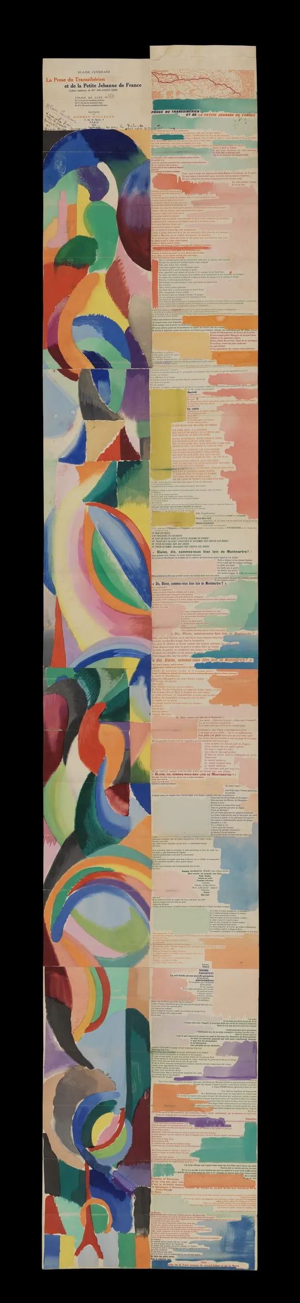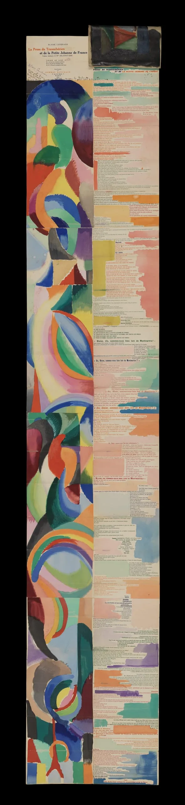 The text recalls an imaginary journey on the newly popular Trans-SIberian Railway taken by a young French sex worker named Jehanne (or Joan). She travels from Moscow to Siberia, China, and the North Pole before arriving in Paris, where the newly-constructed Eiffel Tower, the epitome of modernity, is depicted on the bottom left. Folded up, the work nestles in a hand-colored parchment wallet. Delaunay-Terk, a key figure in the Parisian avant-garde, is known for her vivid and colorful work spanning painting, fashion, and design beginning in 1906. This example of Prose of the Trans-Siberian and of Little Joan of France remained folded for most of its existence, and its colors are thus exceedingly fresh.