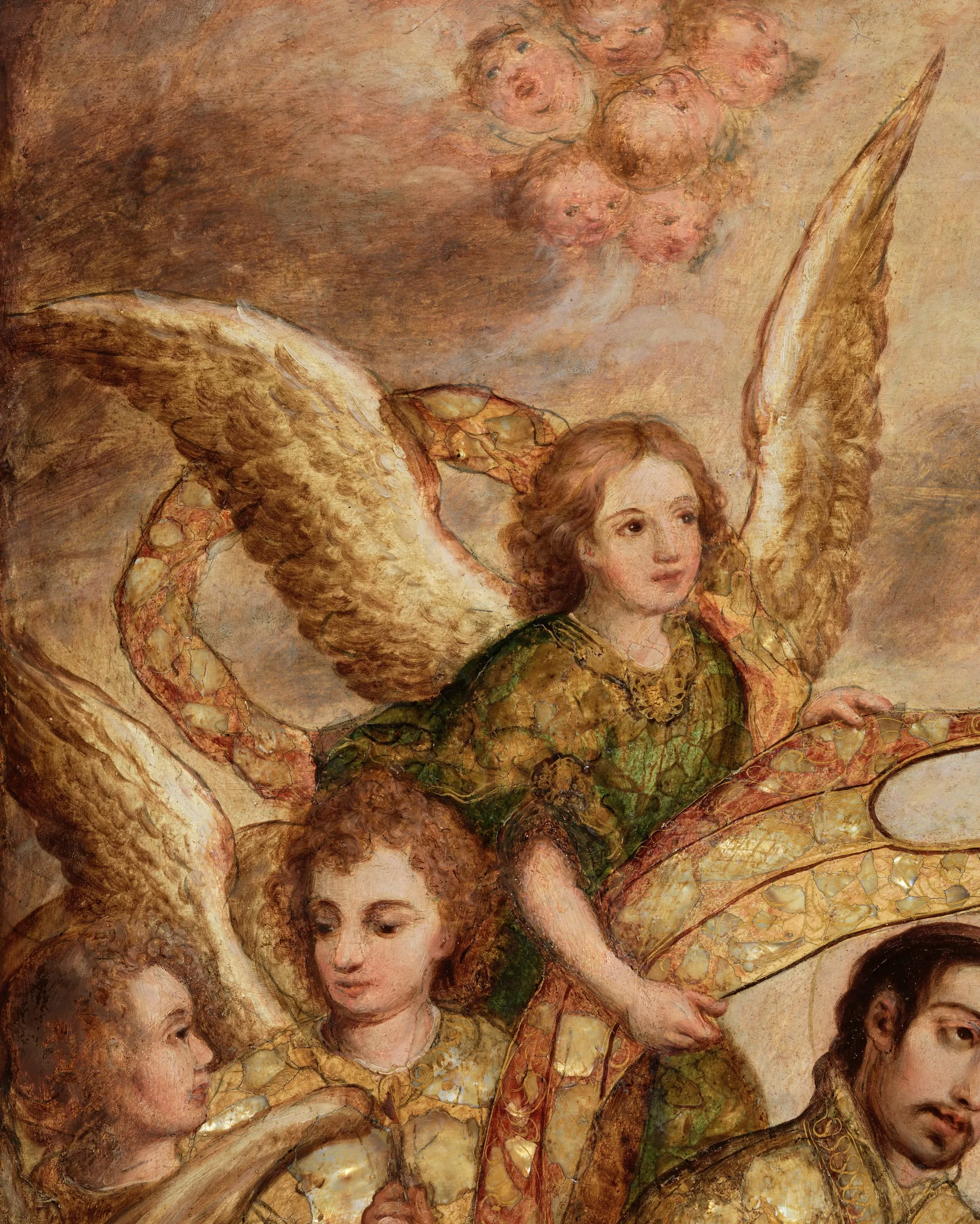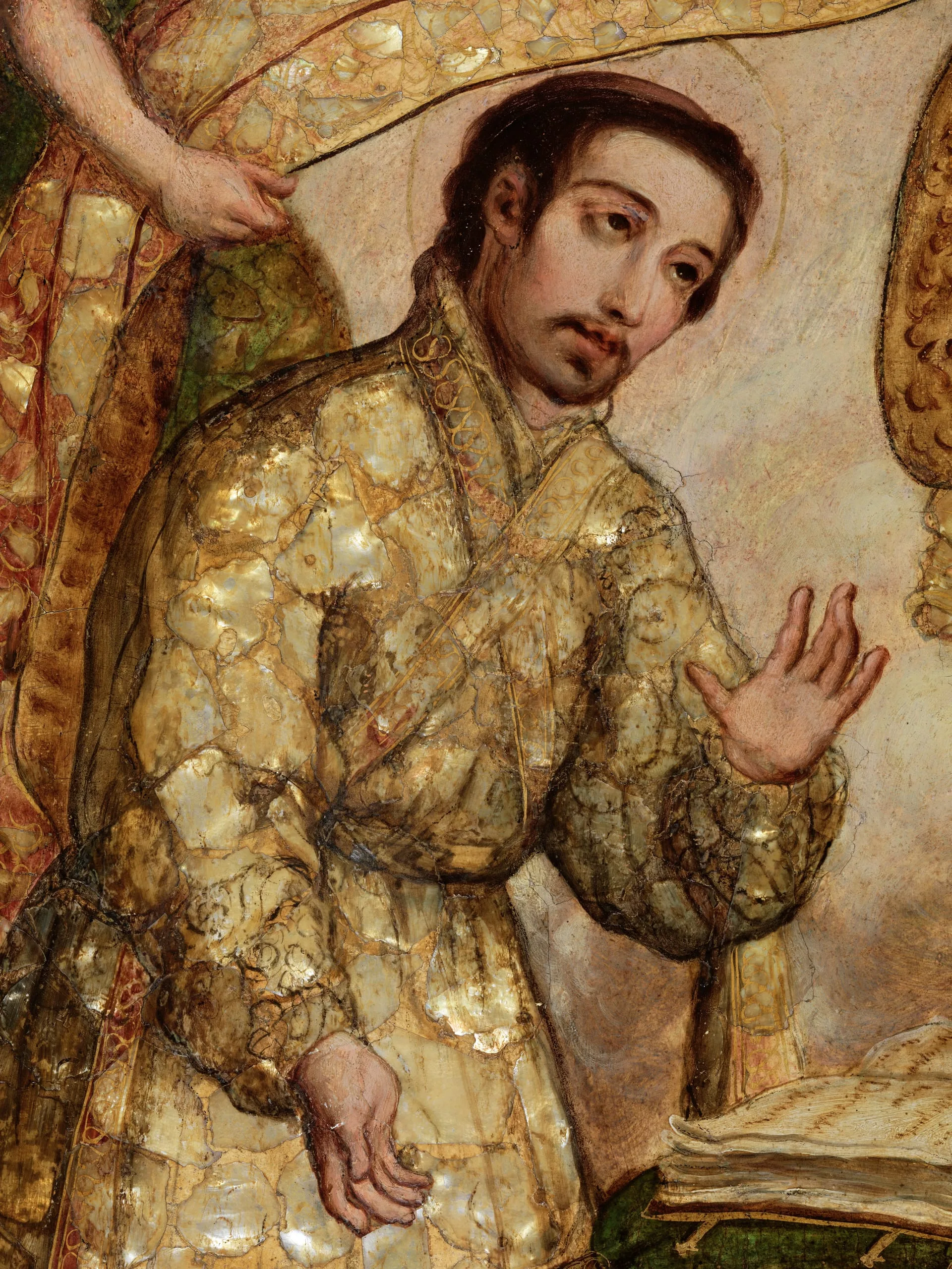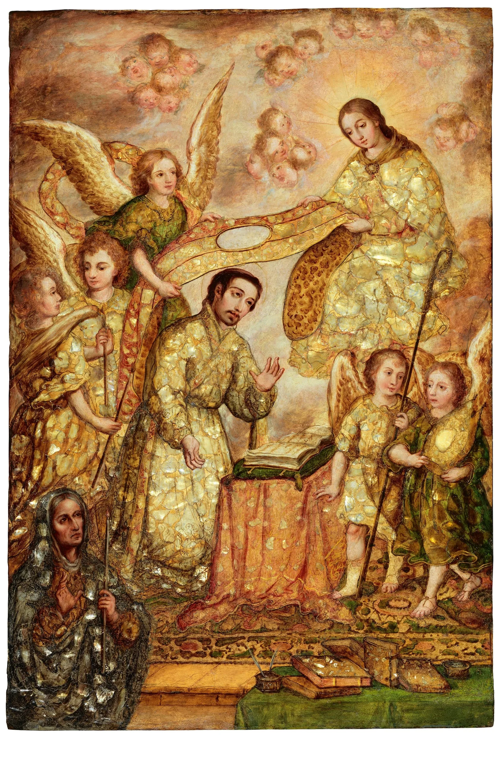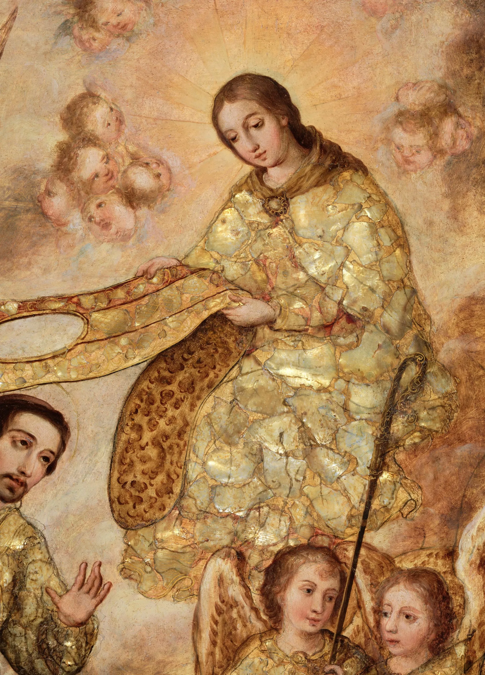 Nicolás Correa, the nephew of the famed mulatto painter Juan Correa (c. 1645–1716), produced a number of fine enconchados. The Imposition of the Chasuble on Saint Ildephonsus depicts a well-known episode of the life of the seventh-century bishop of Toledo, when the Virgin appeared to him and presented him with a priestly vestment from her son’s treasury to reward him for his devotion.
