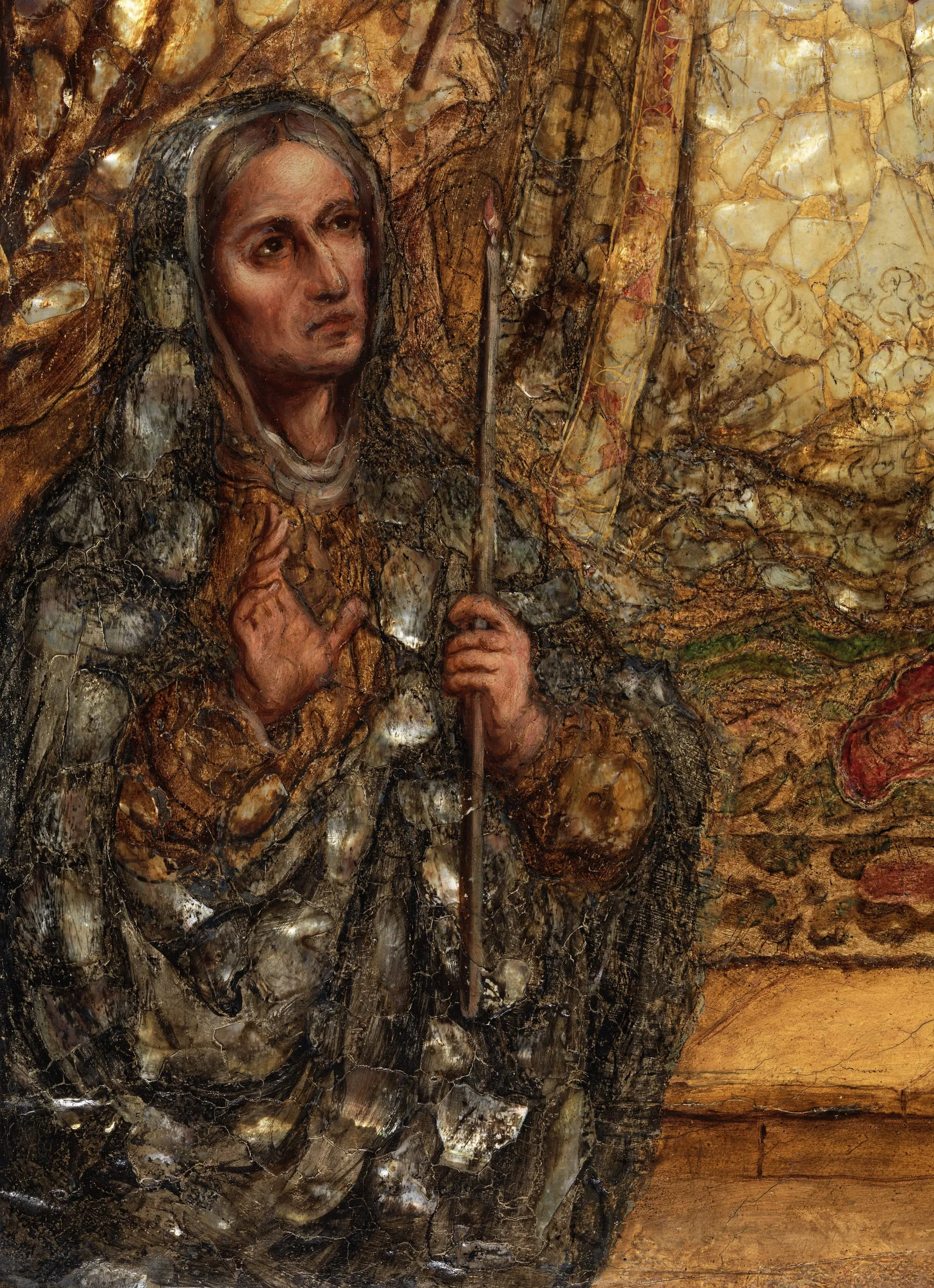 Among the most dazzling paintings invented in New Spain were those inlaid with mother-of-pearl, known as enconchados. Conceived in the traditional manner of Western painting, the works include shell fragments that reference a range of Asian decorative arts, which flowed in through various trade networks. Pearls had also been associated with the legendary riches of the Americas since the conquest. Their materiality connoted imperial power, ostentation, and wealth. The genre reached its apogee from roughly 1680 to 1700, and Nicolás Correa was among its most salient practitioners. Aside from individual devotional pictures, many enconchados were created as multipanel series portraying the lives of the Virgin, Christ, and various saints—the iridescent nacre helping to suffuse the works with a sense of the divine. With their mixed technique, the opalescent enconchados stood at the juncture of imperial vision, global trade, religious fervor, and colonial invention.
