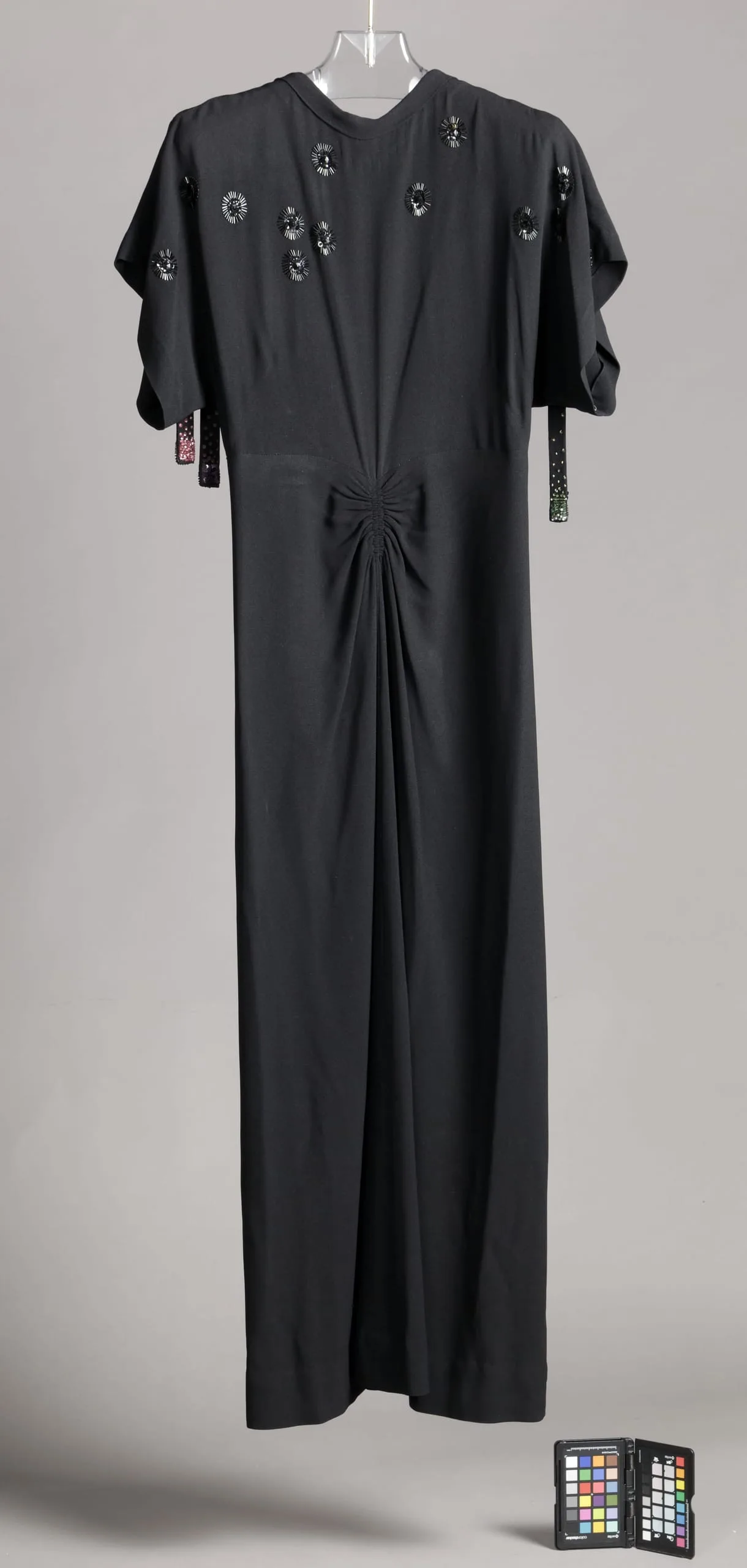 - Rayon plain weave (crepe), with glass beads and plastic sequins