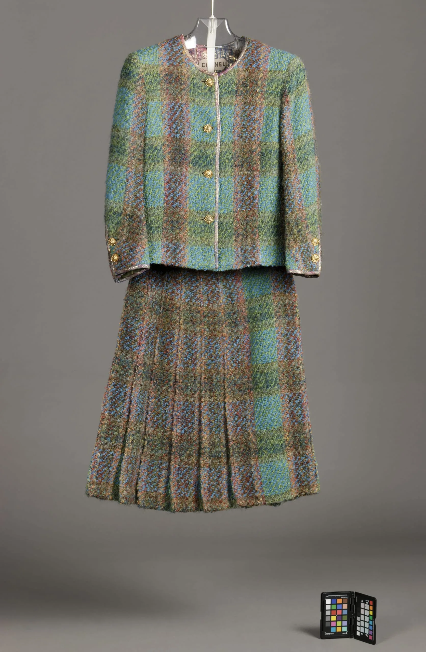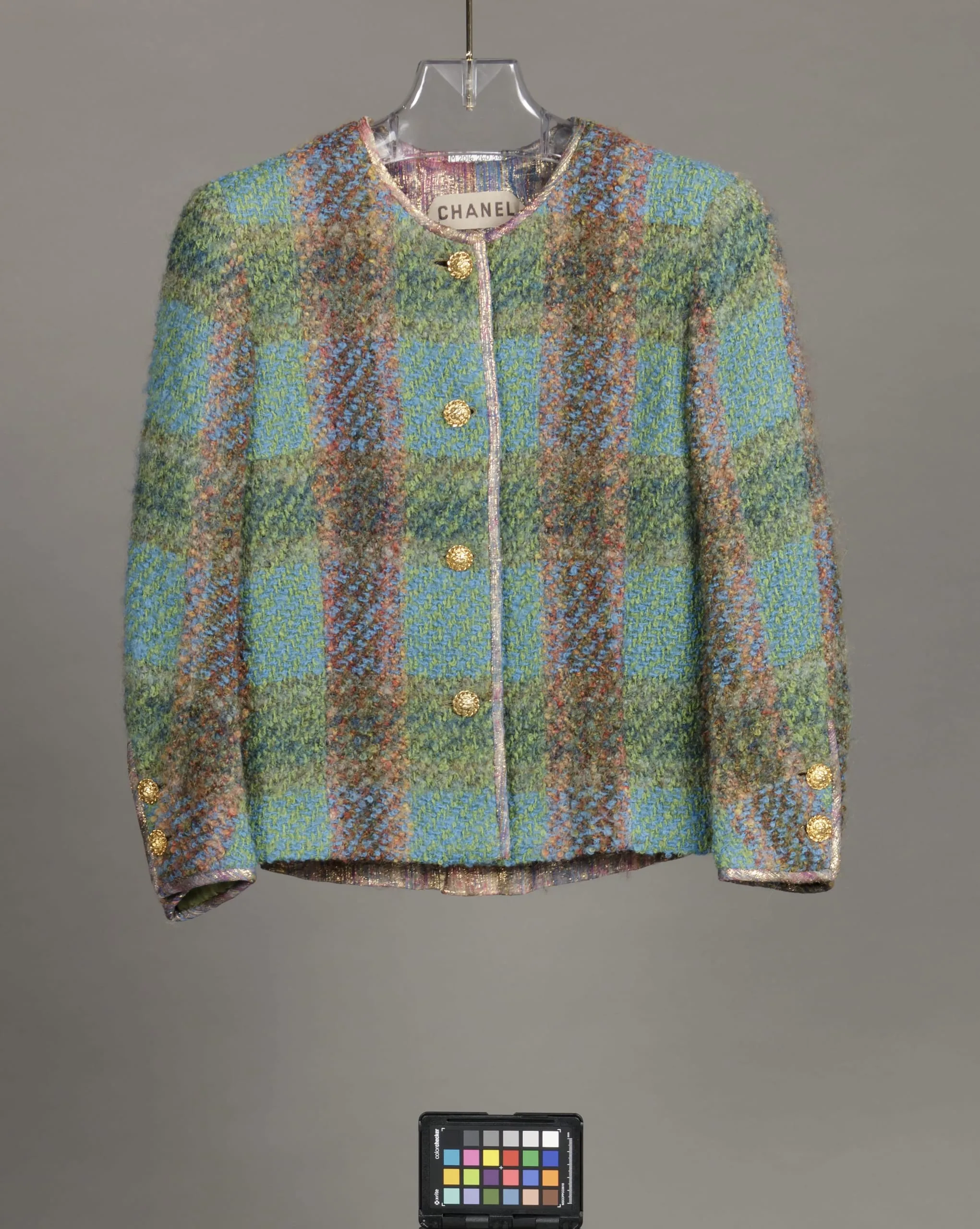 - Wool boucle tweed and silk/metallic plastic plain weave with metal buttons