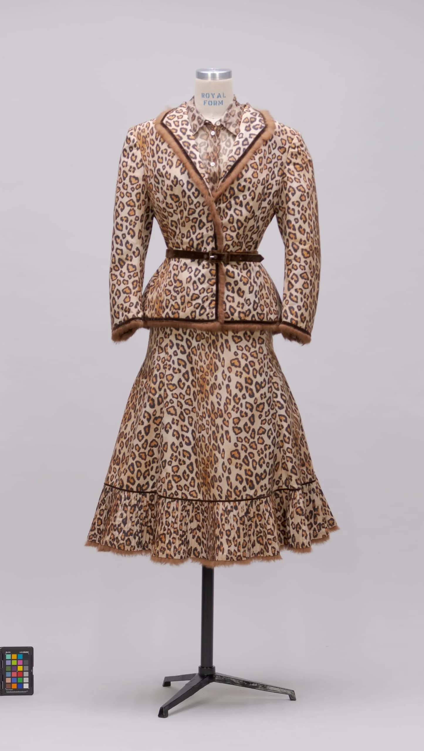 - Jacket and Skirt: Silk plain weave (faille), printed, rabbit fur