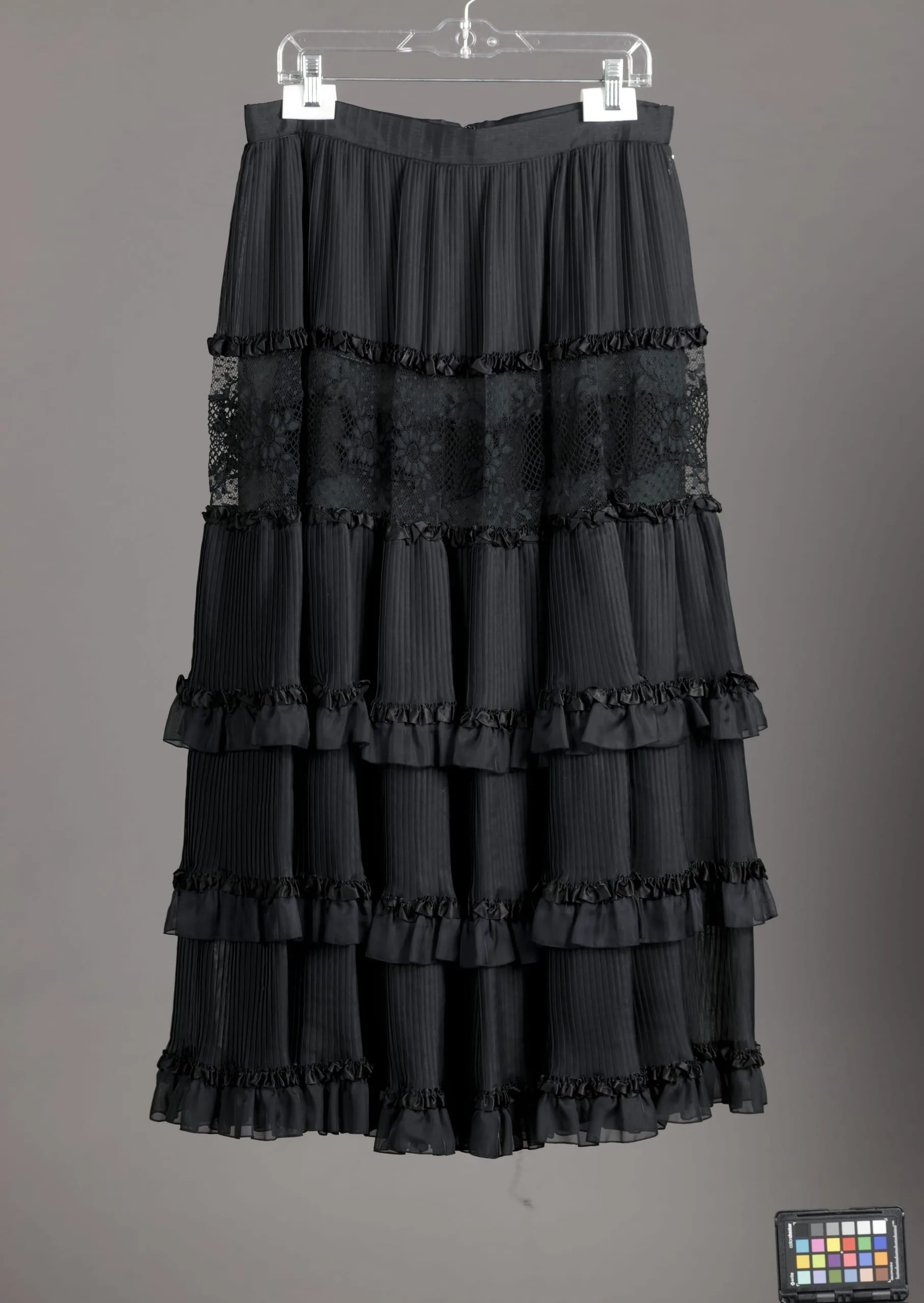 Skirt: Nylon plain weave with heat-set pleats, nylon lace, rayon satin ribbon