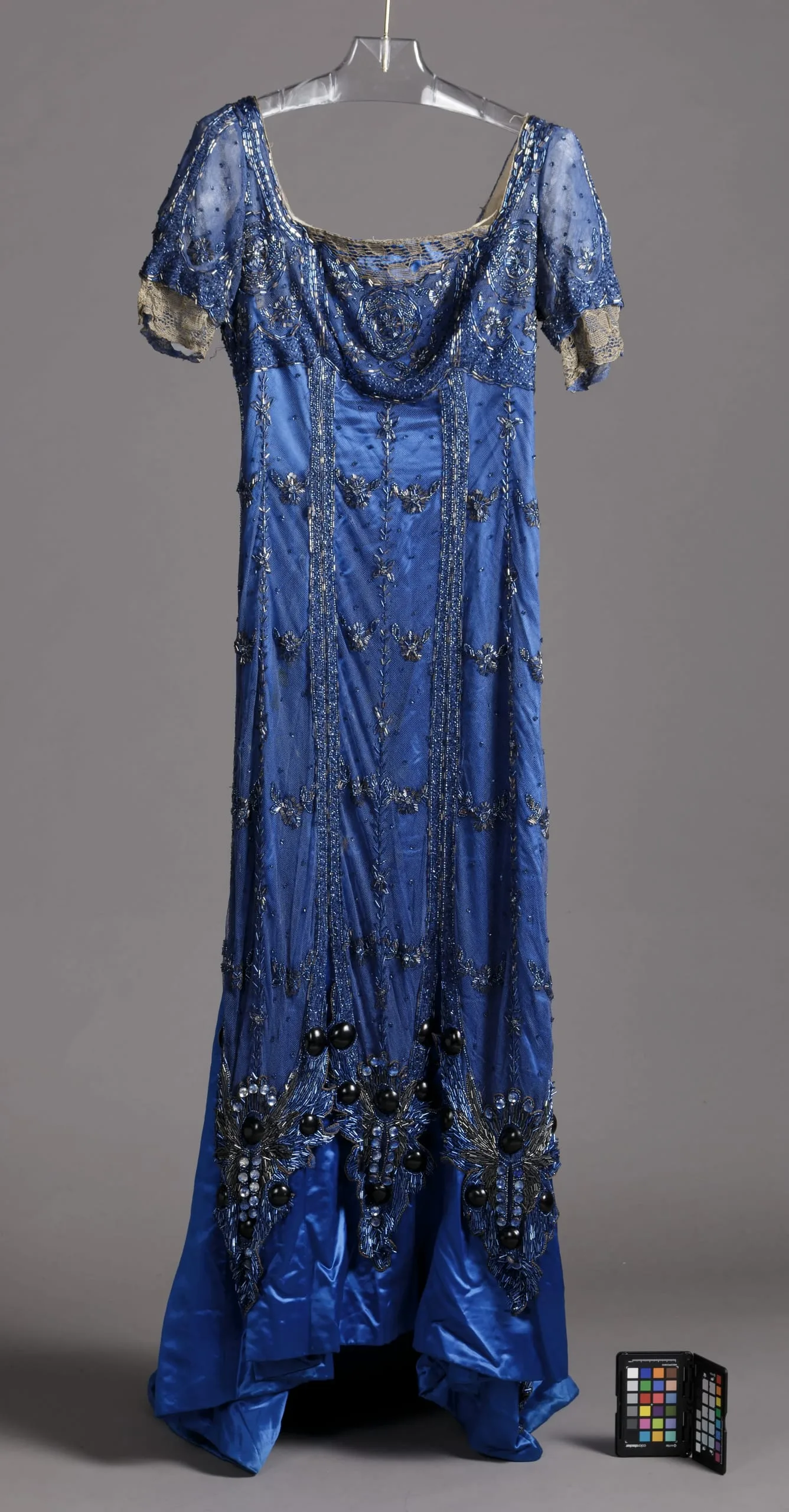 - Silk satin and silk net with silk and metallic lace, glass beads, metallic beads, crystals, and plastic beads