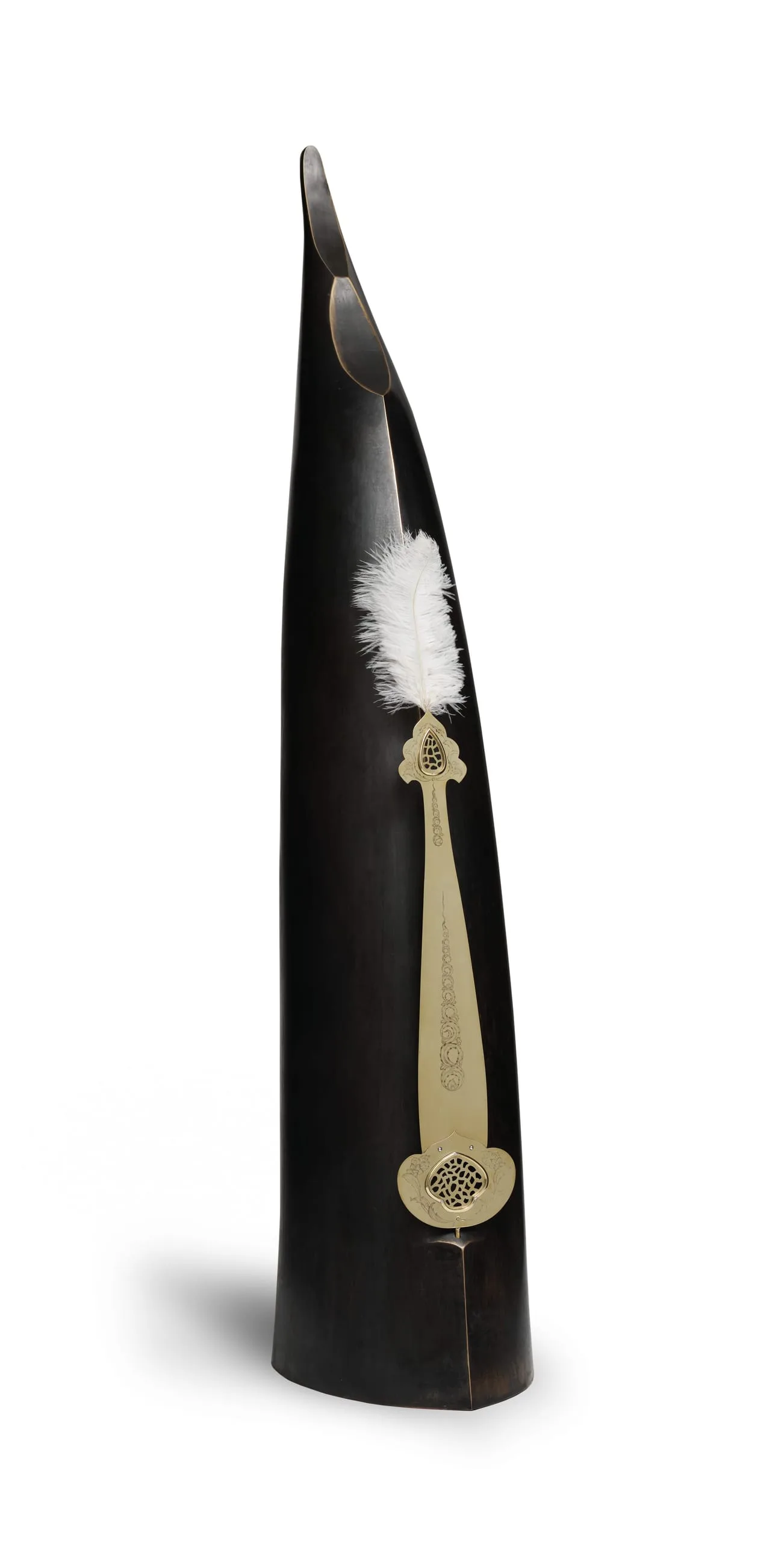 In this sculpture, Tehran-based artist Kourosh Golnari references Iran’s Qajar dynasty by refashioning into metal, and on a grand scale, a style of tall cap made from lamb fleece and worn by leading members of the court, most notably the shah. The intriguing work provides a three-dimensional representation of nineteenth-century royal images and imagery presented in two-dimensional works elsewhere in this catalogue. More than a sculpture of a hat, it personifies and monumentalizes the shah and as such is perhaps intended to provoke debate about Iran’s past rulers.