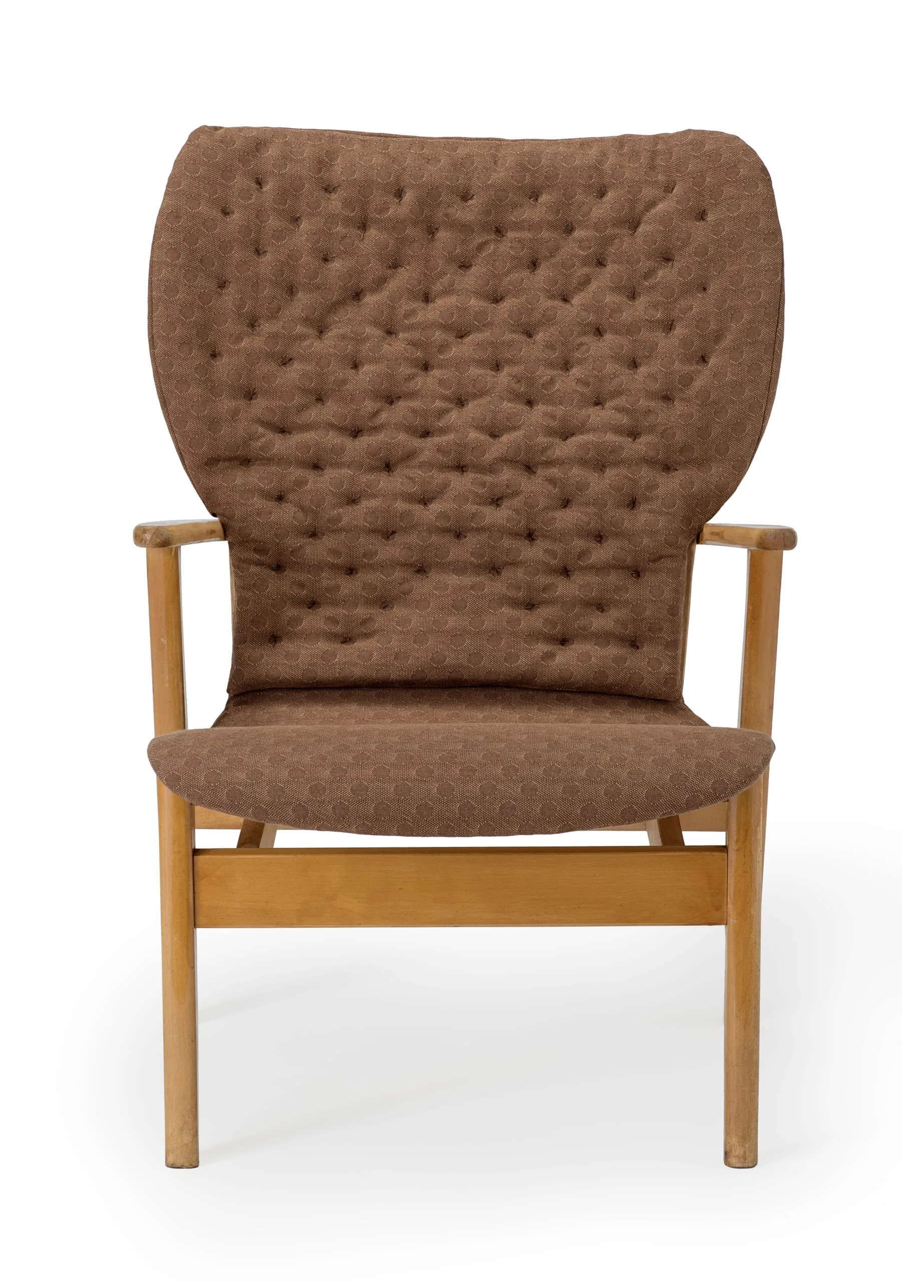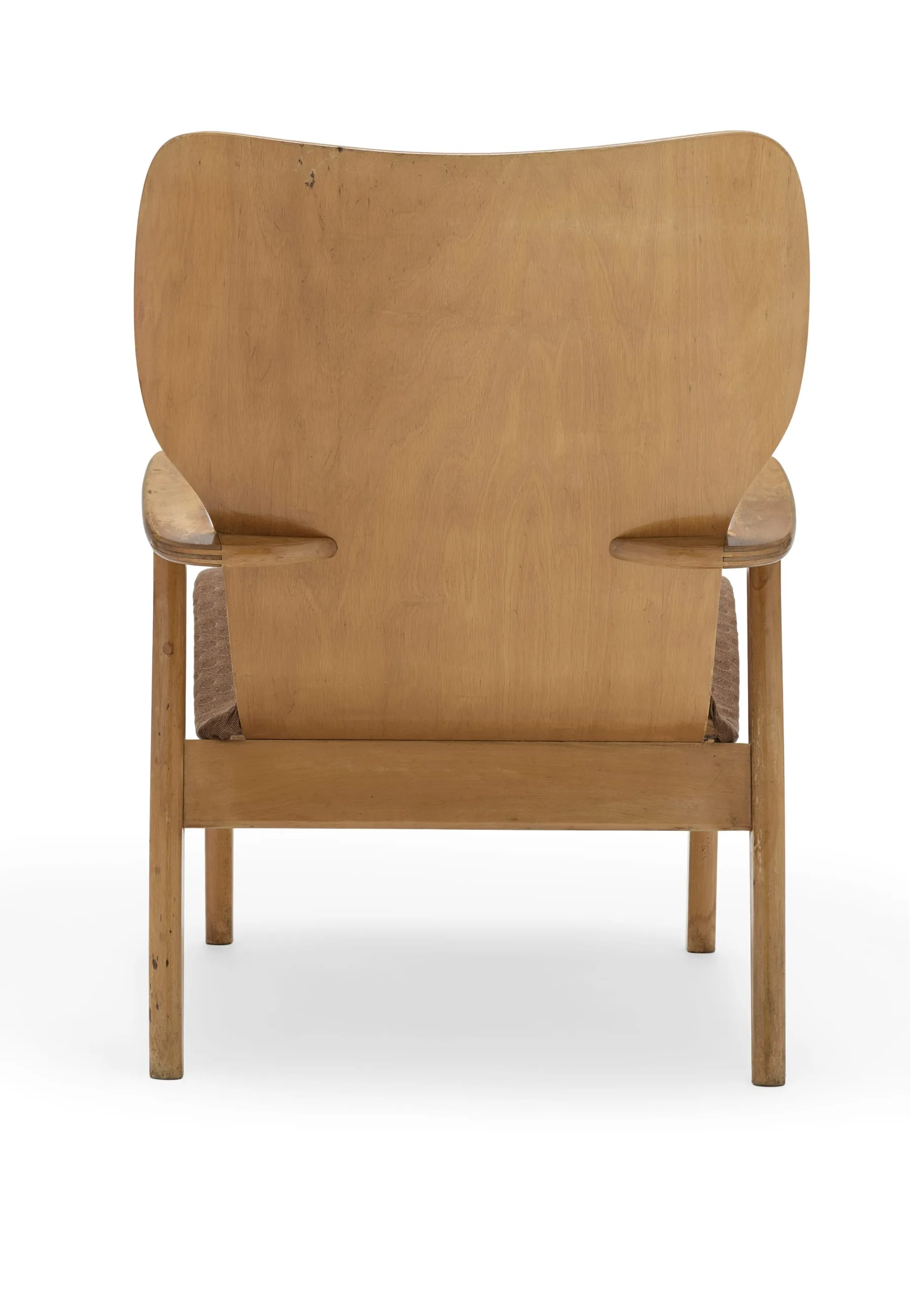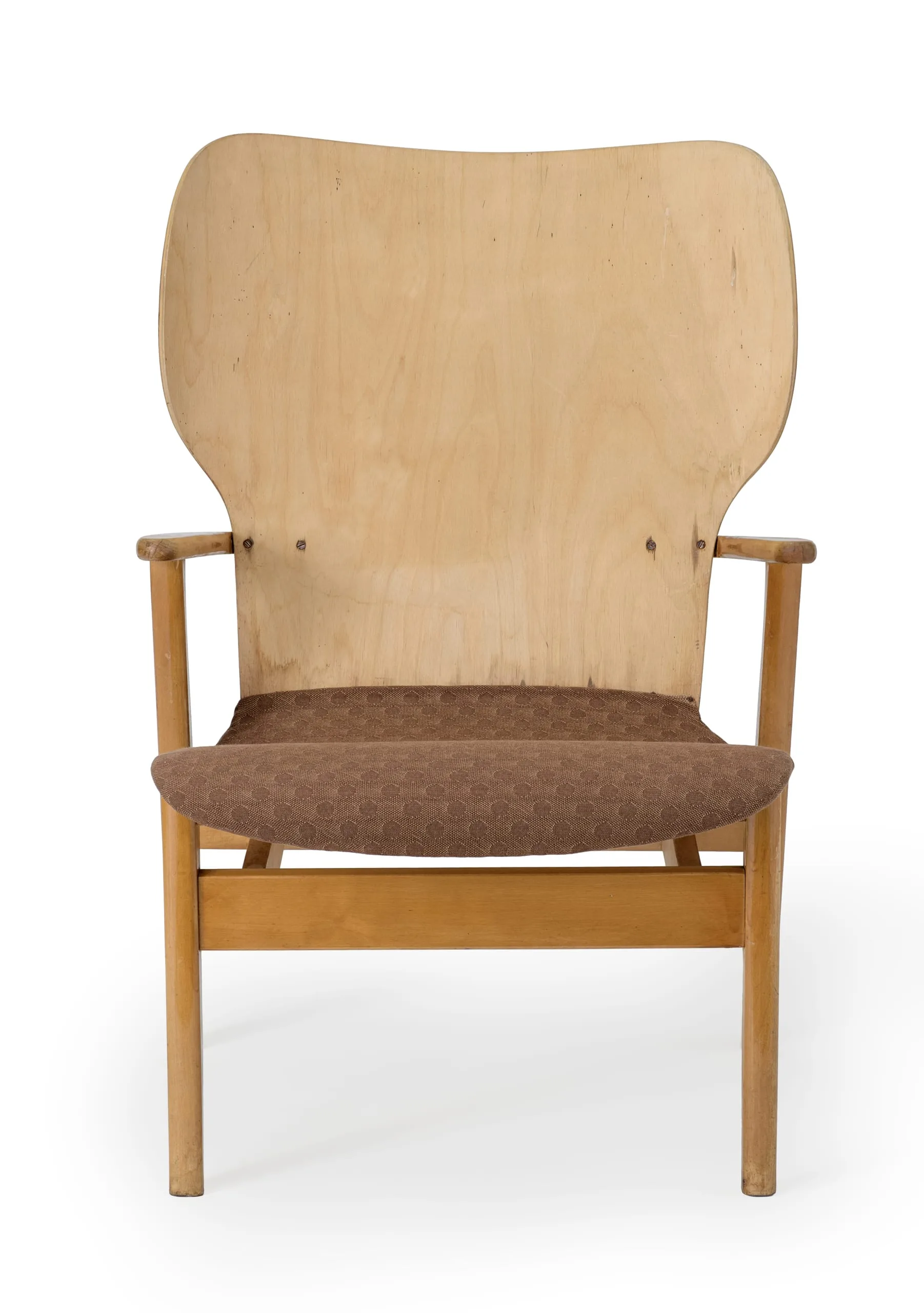 The university commission led to mass production by the Finnish firm Keravan Puuteollisuus and the Domus chair was adopted throughout Finland for schools, cafeterias, and auditoriums. In 1951, the American modern furniture company Knoll Associates, Inc. began to import the side chair into the United States, marketed as the "Finnchair." The Tapiovaaras also designed the inventive packing and packaging. The chairs shipped disassembled, so that ten chairs could fit in one cardboard shipping box that measured a quarter of a square meter ( predating the IKEA flat-pack). The chairs were also designed to stack, giving them additional functionality. This example is the armchair model, sometimes known as the "Domus Deluxe." It came from Tapiovaara’s own studio and retains its original upholstery.