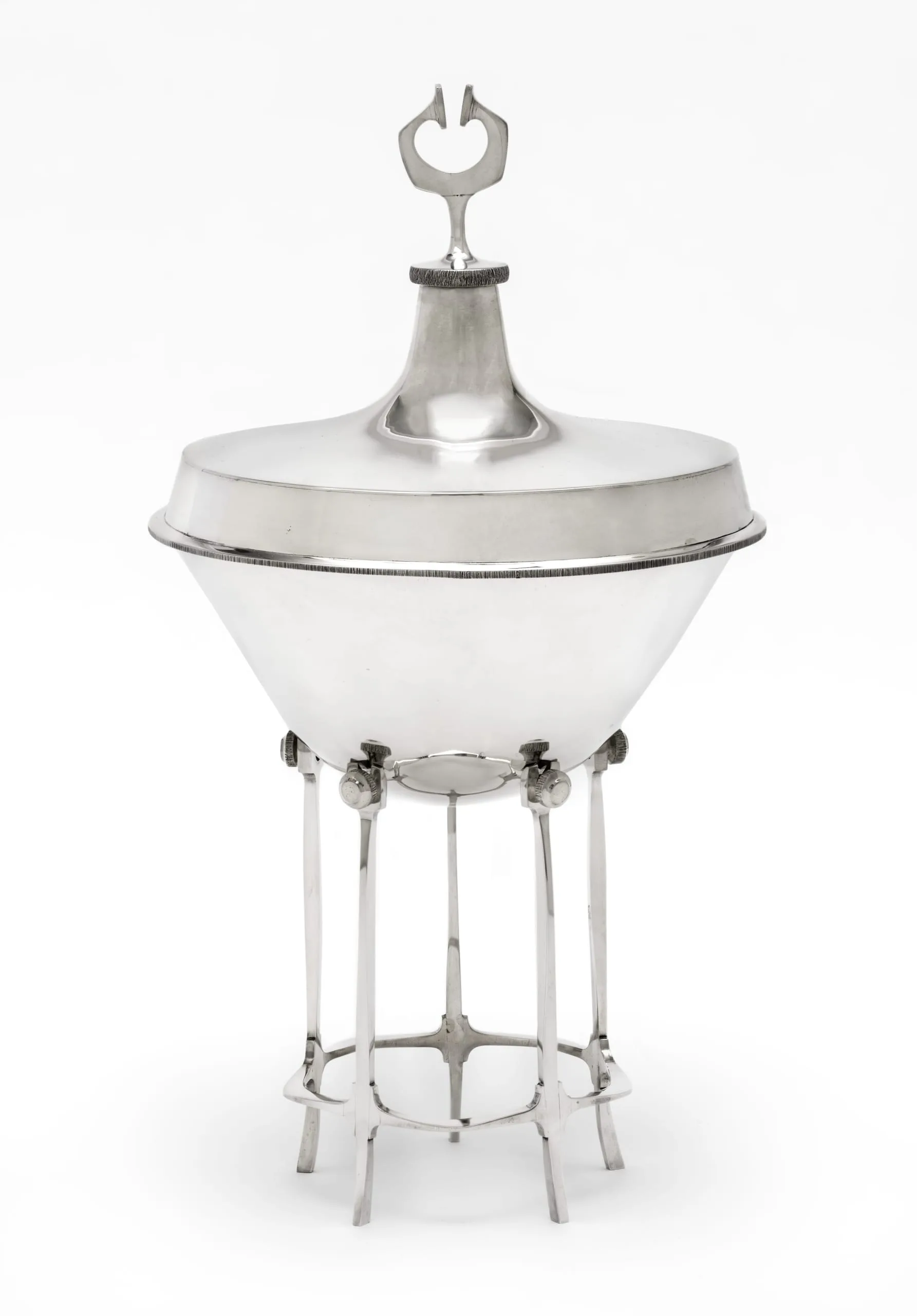 This elegant footed bowl was first shown in the Pasadena Art Museum’s 10th California Design exhibition—the 1968 iteration of this landmark series curated by Eudorah Moore (1918-2013) starting in 1962. Held from 1954 through 1976, these exhibitions helped define the history of design and craft in the state. Since the majority of the metalwork featured was jewelry, surviving hollowware from these shows is scarce. Prominently illustrated in the exhibition’s catalogue, this bowl was made by college art professor Charles Escott during his postgraduate training with influential metal instructor Alvin Pine (1933-2010) at California State University, Long Beach. Escott participated in several other juried exhibitions in the period including the American Craft Council’s Craftsmen USA ’66 (1966) and the Society of North American Goldsmiths’ first exhibition Goldsmith ’70 (1970).
