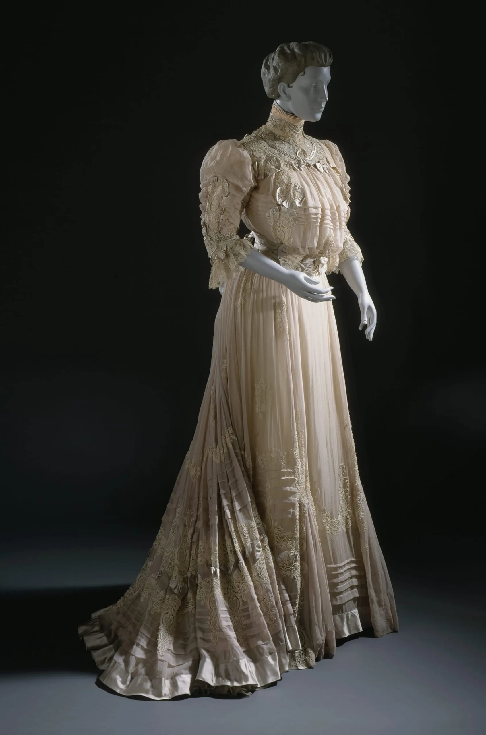 - Bodice: silk plain weave (crepe chiffon) with silk satin, linen lace, and metal beads; Skirt: silk plain weave (crepe chiffon)