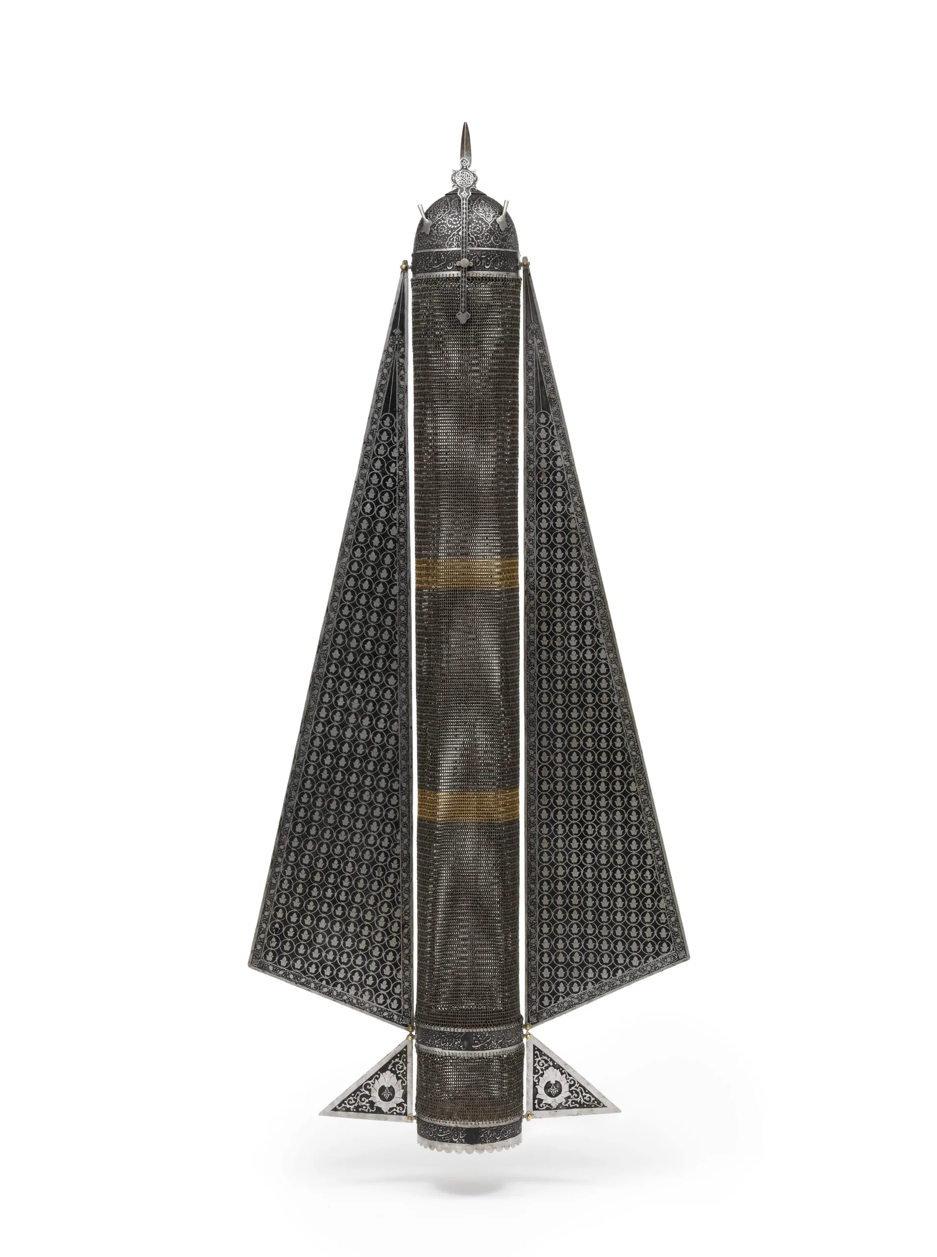 At 6 feet tall, Shahpour Pouyan’s sculpture Projectile 8 looks at once like a missile used in modern warfare and a medieval warrior standing at the ready. A battle helmet sits atop a cylinder of chainmail from which wings and fins protrude, resulting in a silhouette that accentuates the work’s anthropomorphism. The metalwork is finely decorated with calligraphy and ornate floral designs. It is an imposing construction, but also one that connotes an air of elegance. To produce it and other works from his Projectiles series, Pouyan worked with Iranian artisans trained in creating traditional armor ensembles for ta’ziya, Shi’ite passion plays whose anachronistically costumed reenactors memorialize the death of Imam Hussein.