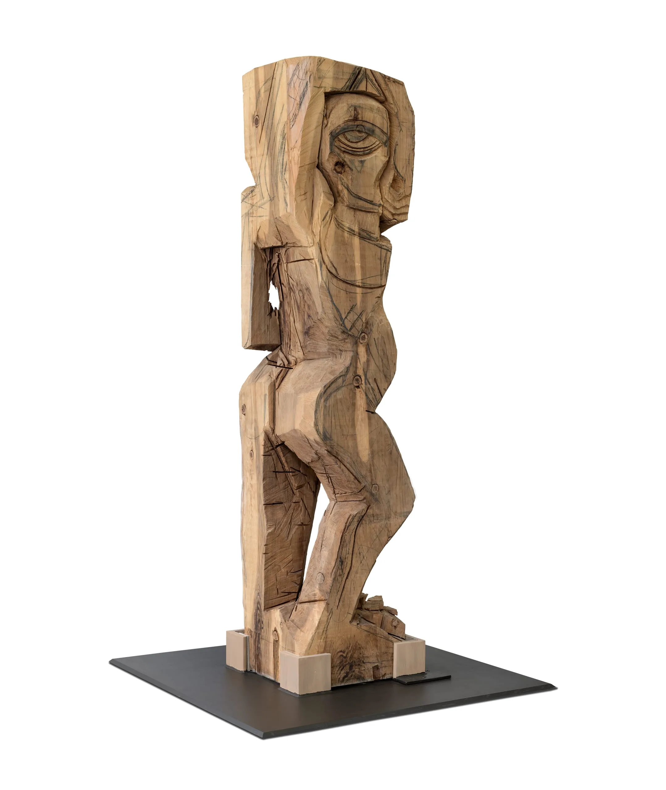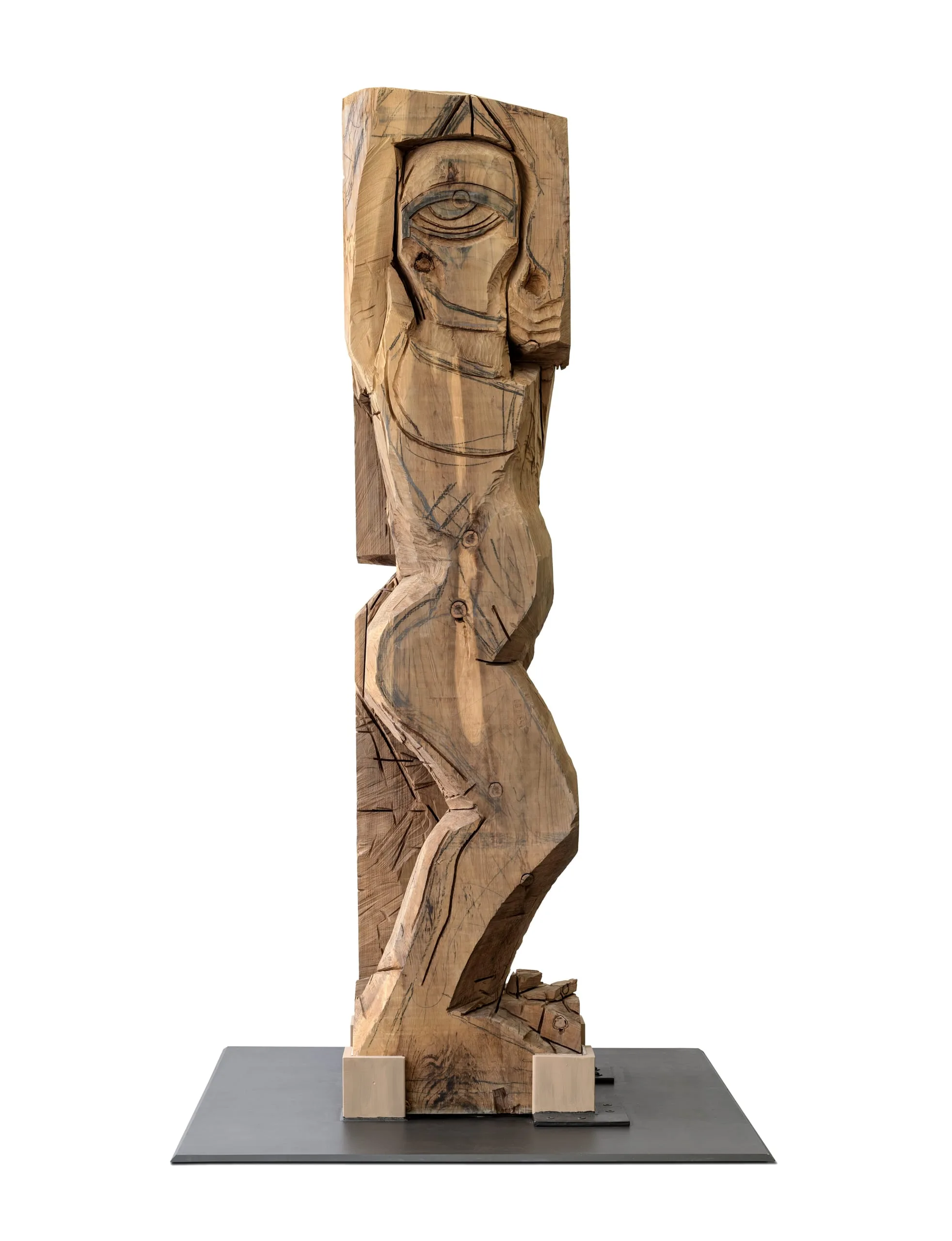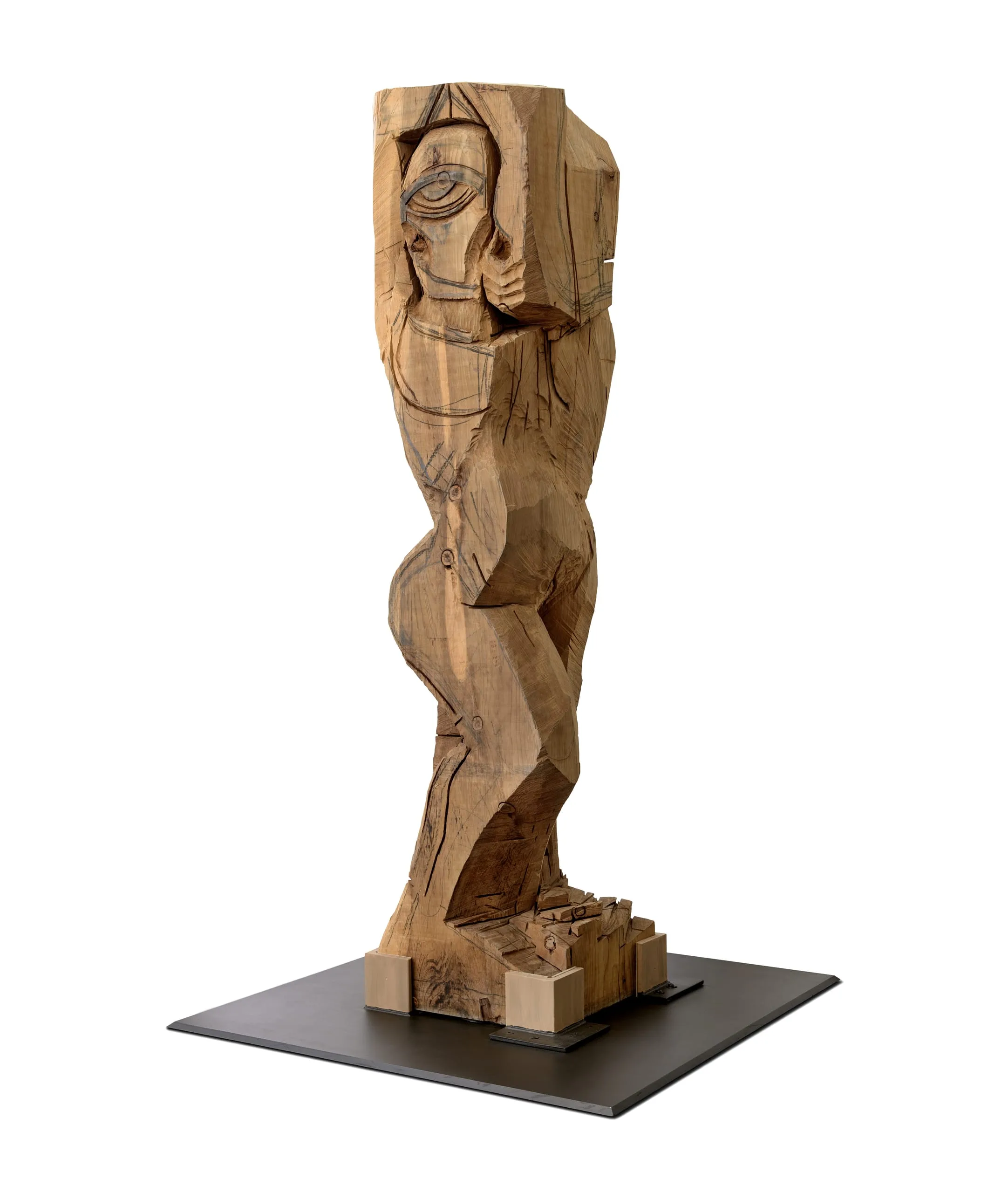 To create Rattlesnake figure (carving), one of his most monumental wood sculptures, Housego sketched a standing human form onto the flat sides of a twelve-foot high redwood block and partially carved out the figure with a rough, jagged blade. Only partly released from the block, the towering figure inevitably calls to mind Michelangelo's marble “Slaves” as well as wood sculptures carved by German Expressionist artists including Erich Heckel, Ernst Ludwig Kirchner, and Karl Schmidt-Rottluff, or the more recent wood carvings of George Baselitz. In Rattlesnake figure (carving) one feels Houseago working directly in the material, where blow by blow the figure is released from the large wooden block.
