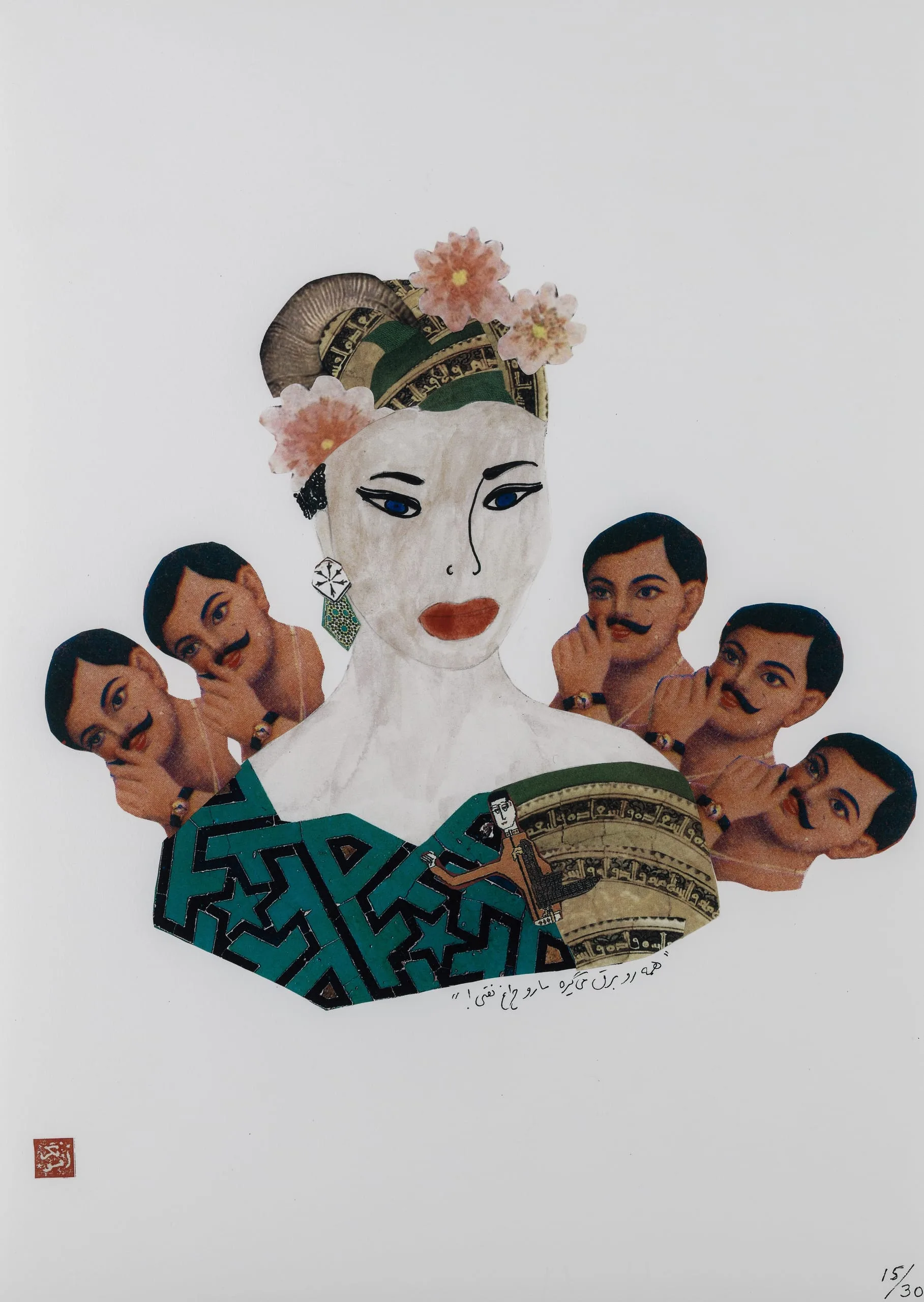 Afsoon’s series, "Persian Expressions," is inspired by the allegorical and often humorous messages behind popular Persian proverbs. The artist illustrates these amusing sayings according to her own spontaneous, subjective, and comical imagination. Electricity or Oil is based on a popular expression that loosely translates to "just my luck." The work depicts an attractive young woman who complains of her rotten luck of being surrounded by men whom she does not find very appealing. Born in Iran in 1961 but now based in London, Afsoon has shown her work in multiple solo and group exhibitions around the world, including the United States, the United Kingdom, Europe, Morocco, Dubai, and Jeddah. As a writer, she has also published a novel and a number of short stories.