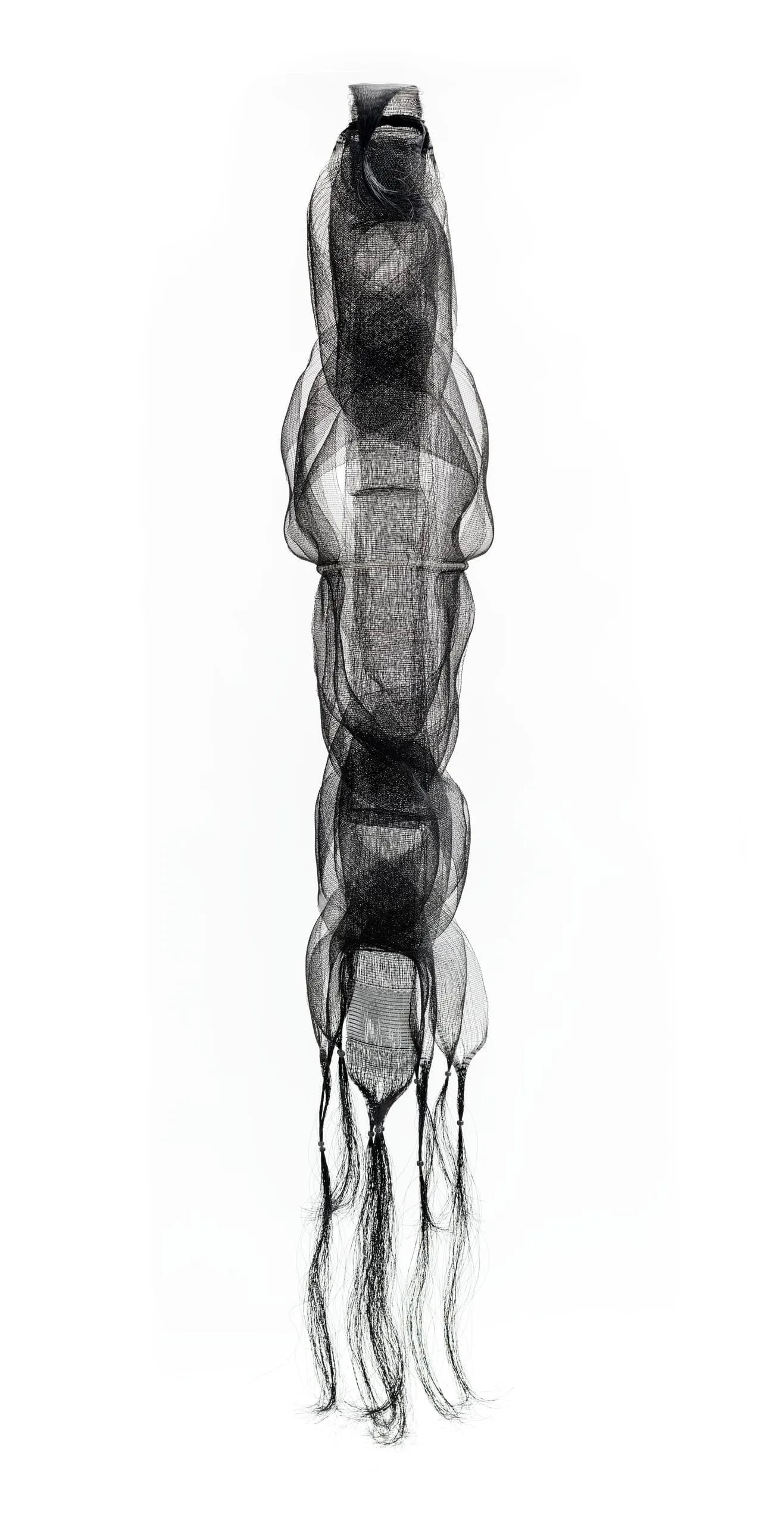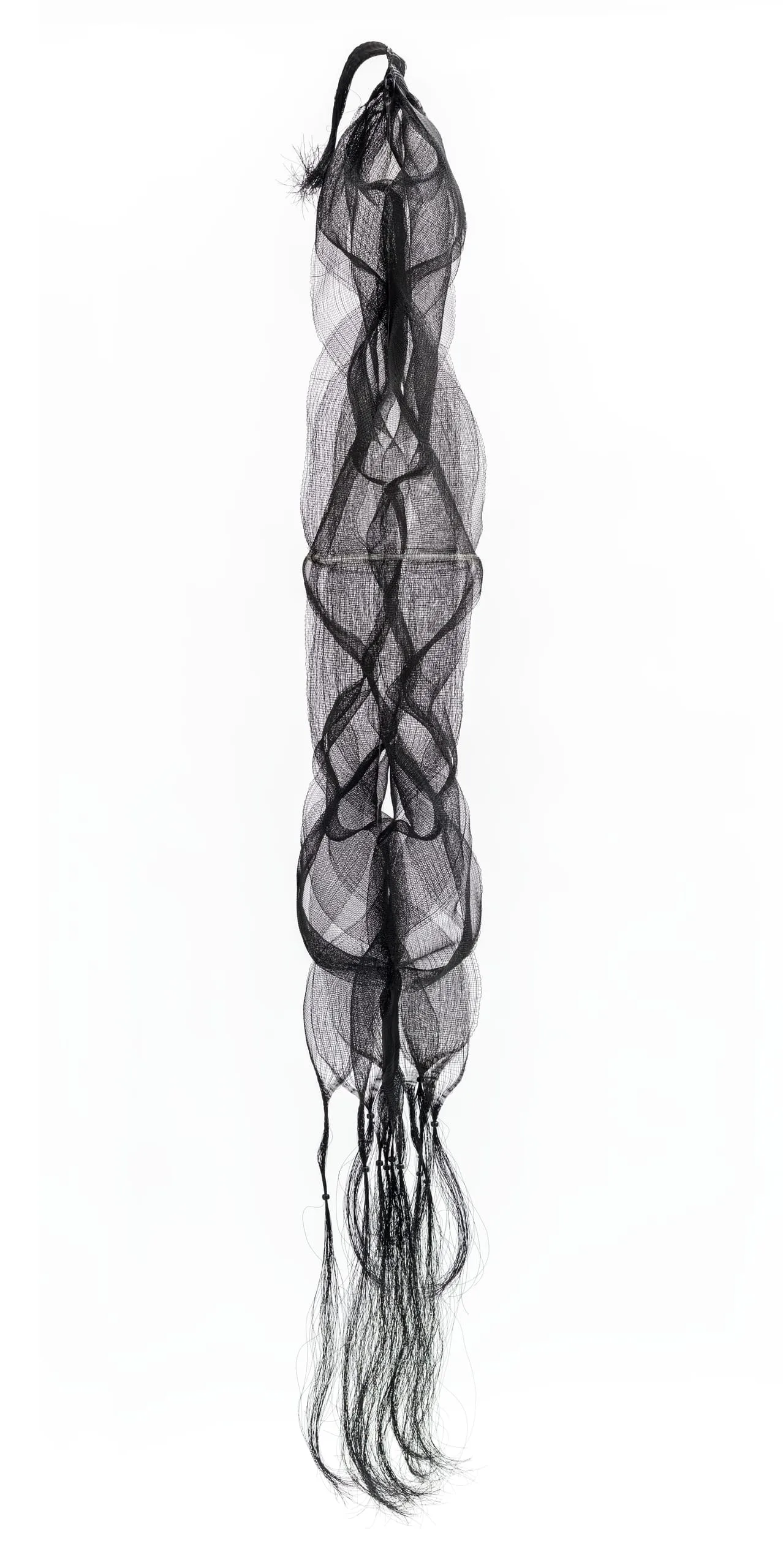 - Dyed nylon monofilament, wood beads, plastic tubing