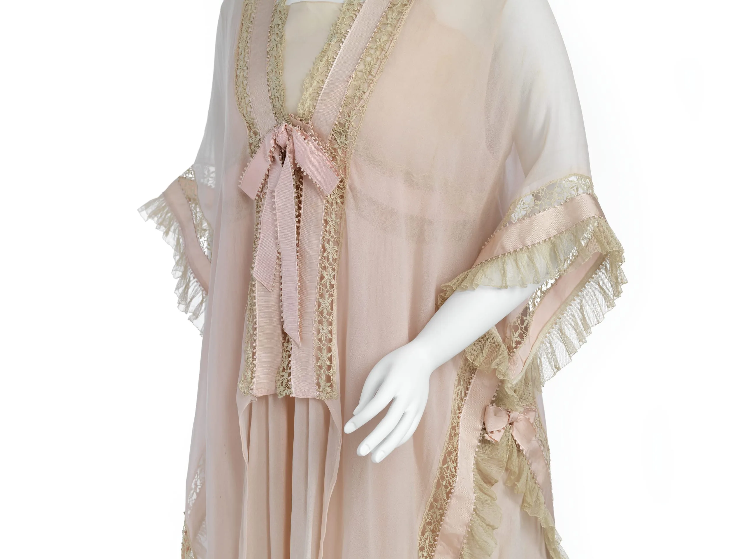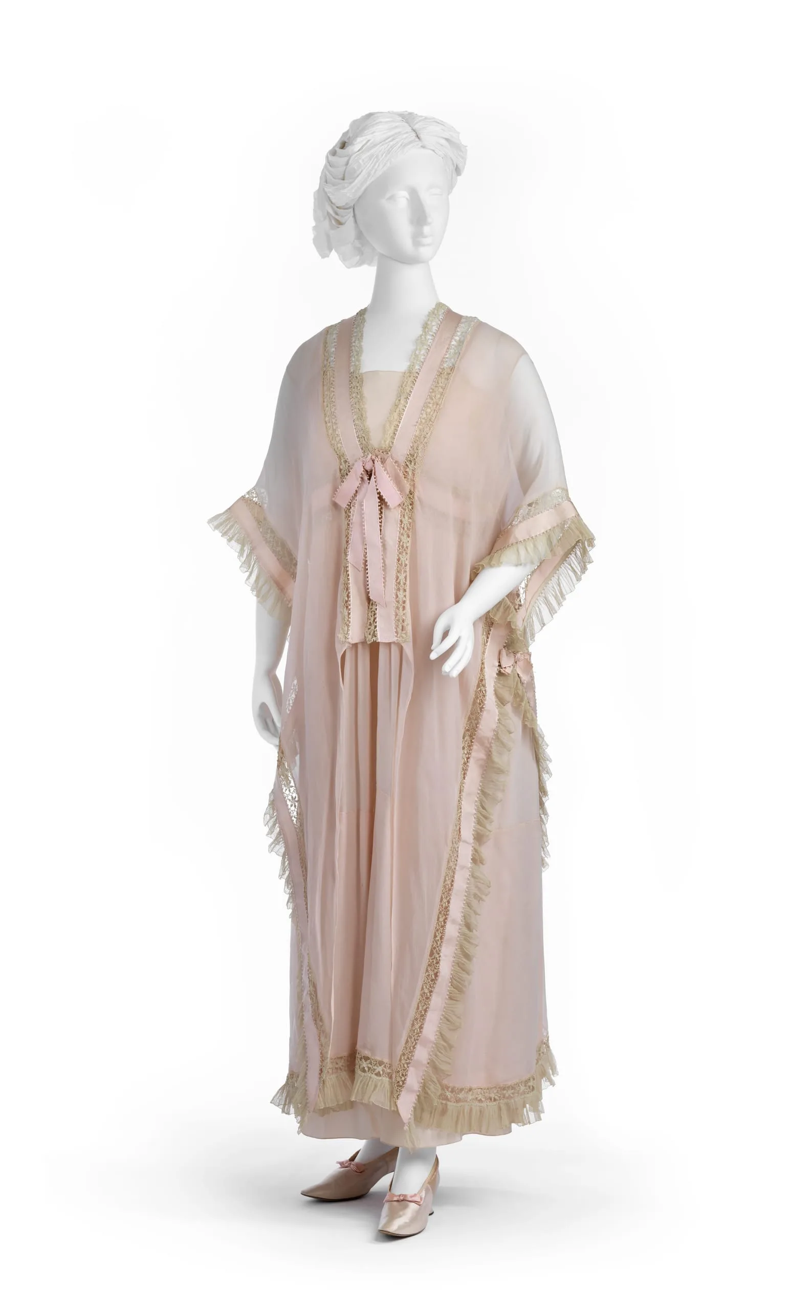 - Silk plain weave (crepe chiffon), with linen needlelace, silk tulle, and silk grosgrain ribbon