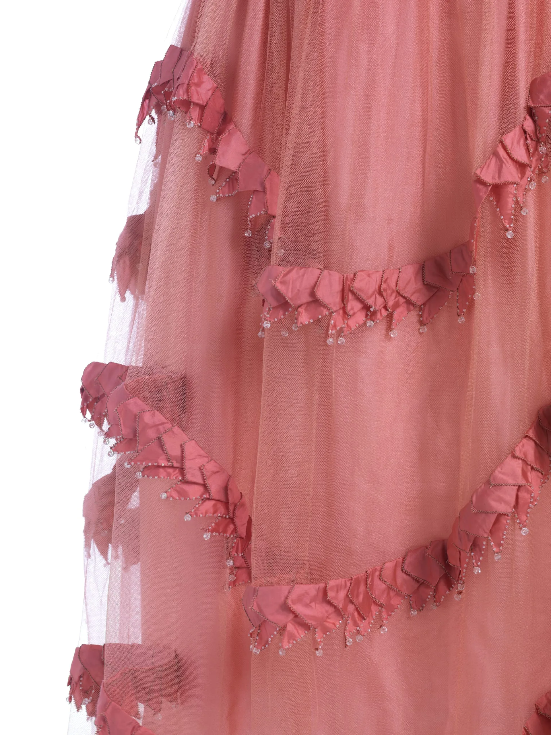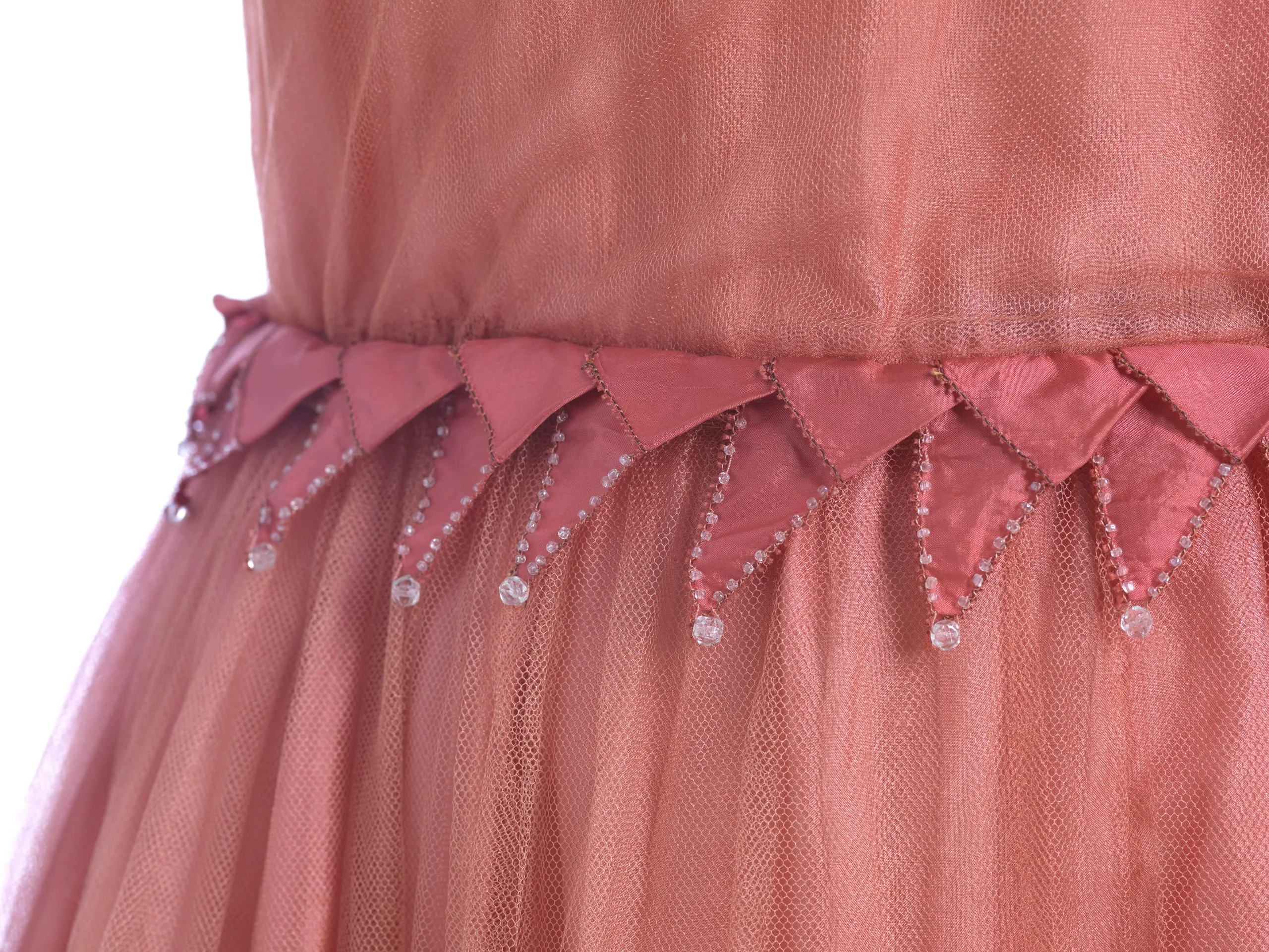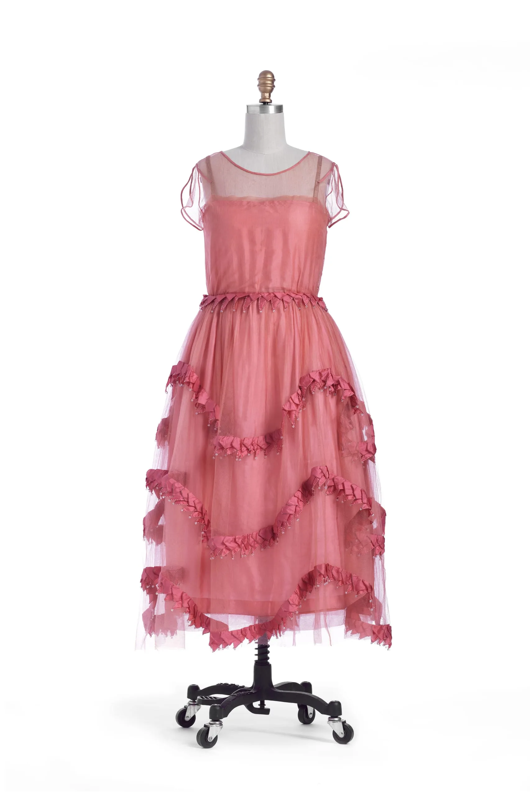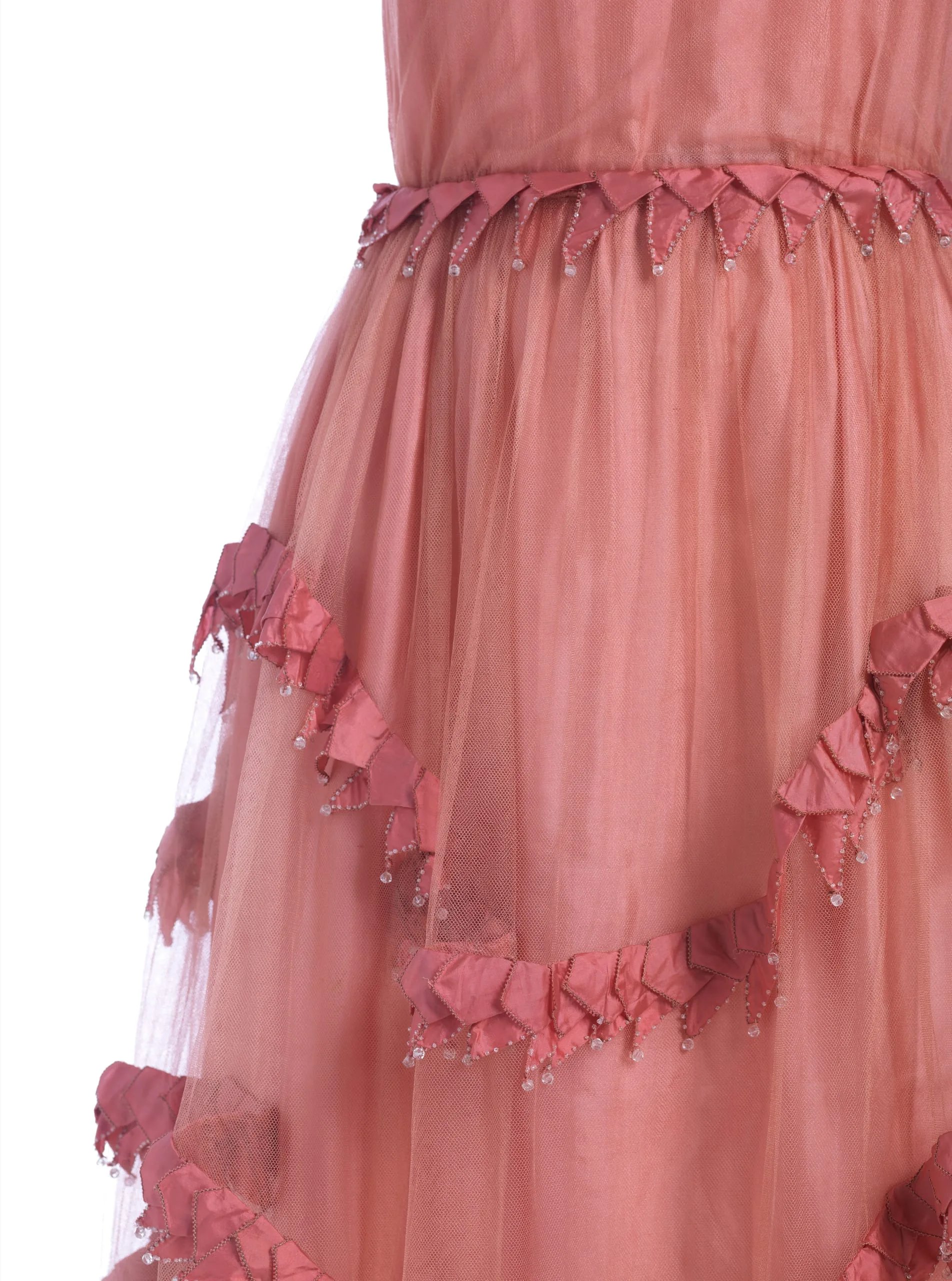 - Dress: silk tulle, with silk satin ribbon and glass beads; Slip: silk plain weave, silk ribbon