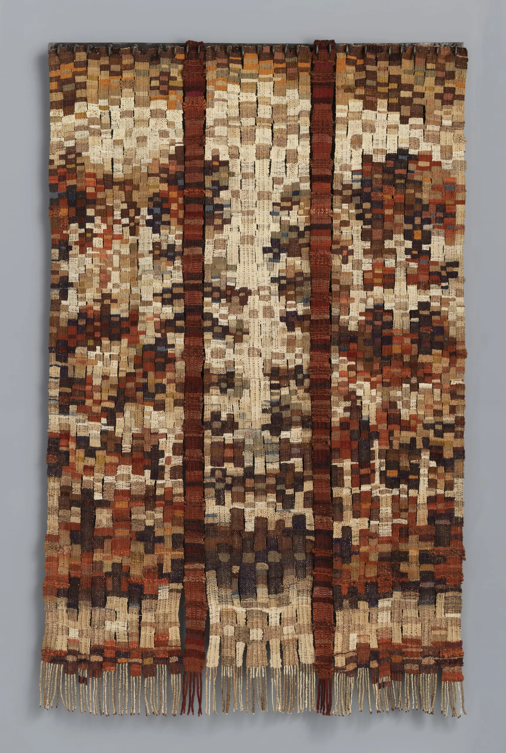 In the 1970s, Bassler and his wife Veralee, a ceramist, ran a summer program for American teenagers in Oaxaca. Awed by the region’s indigenous textiles, Bassler incorporated many local techniques and forms into his own work. The three-panel structure of this 1974 hanging references a ubiquitous Mesoamerican tunic called a huipil. The piece exemplifies Bassler’s cross-cultural melding: he acquired the native silks from a Zapotec artisan and dyed them using materials gathered both in the Santa Monica Mountains and in Mexico.