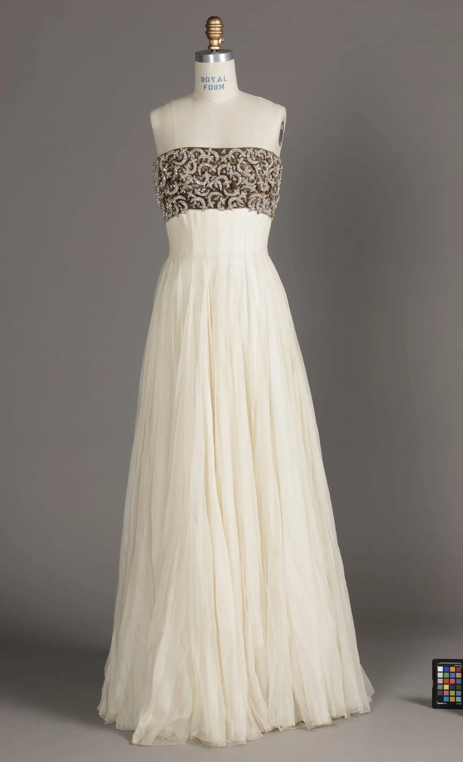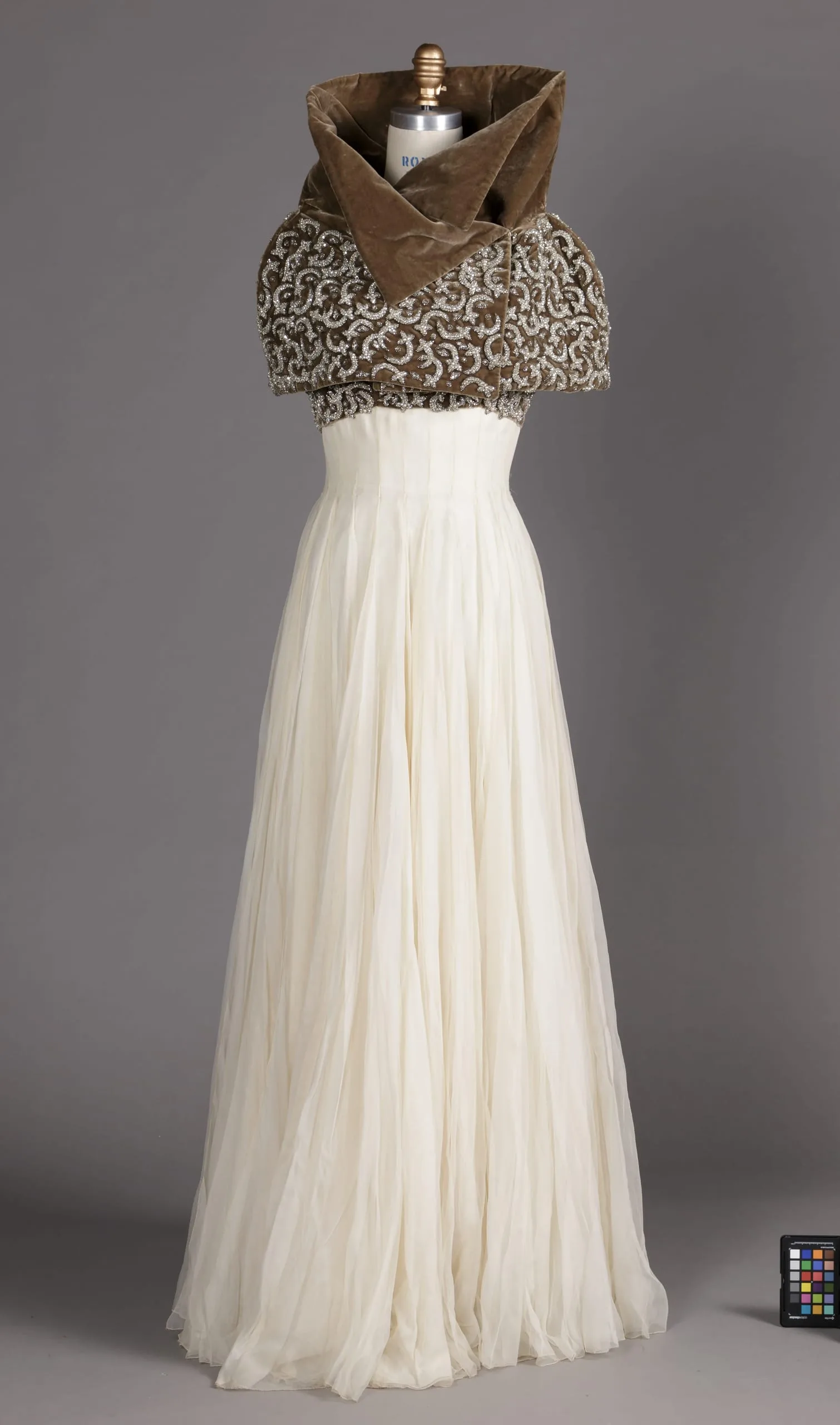 - Dress: Silk gauze, rayon plain weave (crepe),. and silk velvet, with crystals, metal beads and glass beads