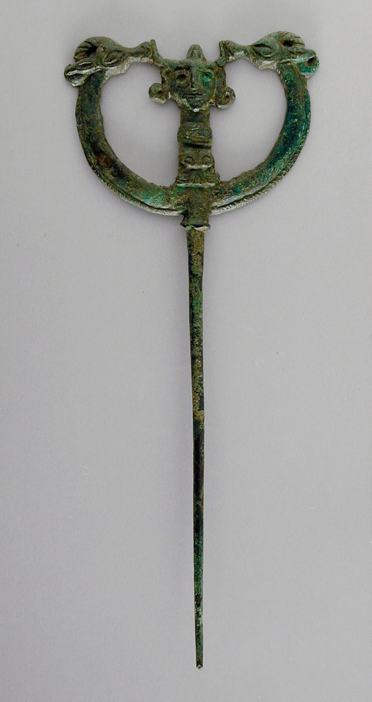 Bronze pin with horseshoe-shaped arch terminating in animal heads, a central mask-like face, and a long tapering spike; heavily patinated in green and turquoise