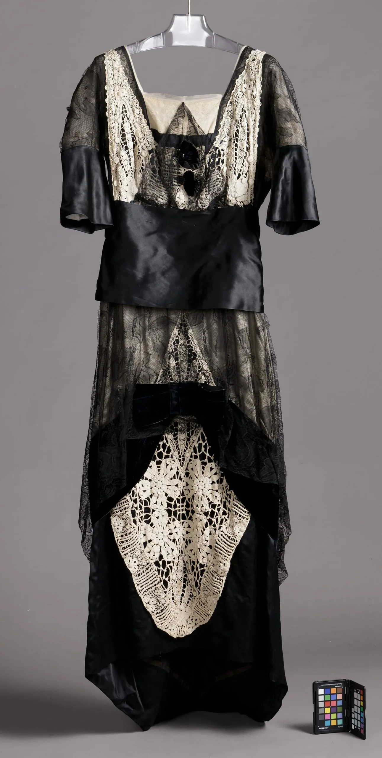 - Silk satin with silk lace, linen lace, silk velvet ribbon, and silk net