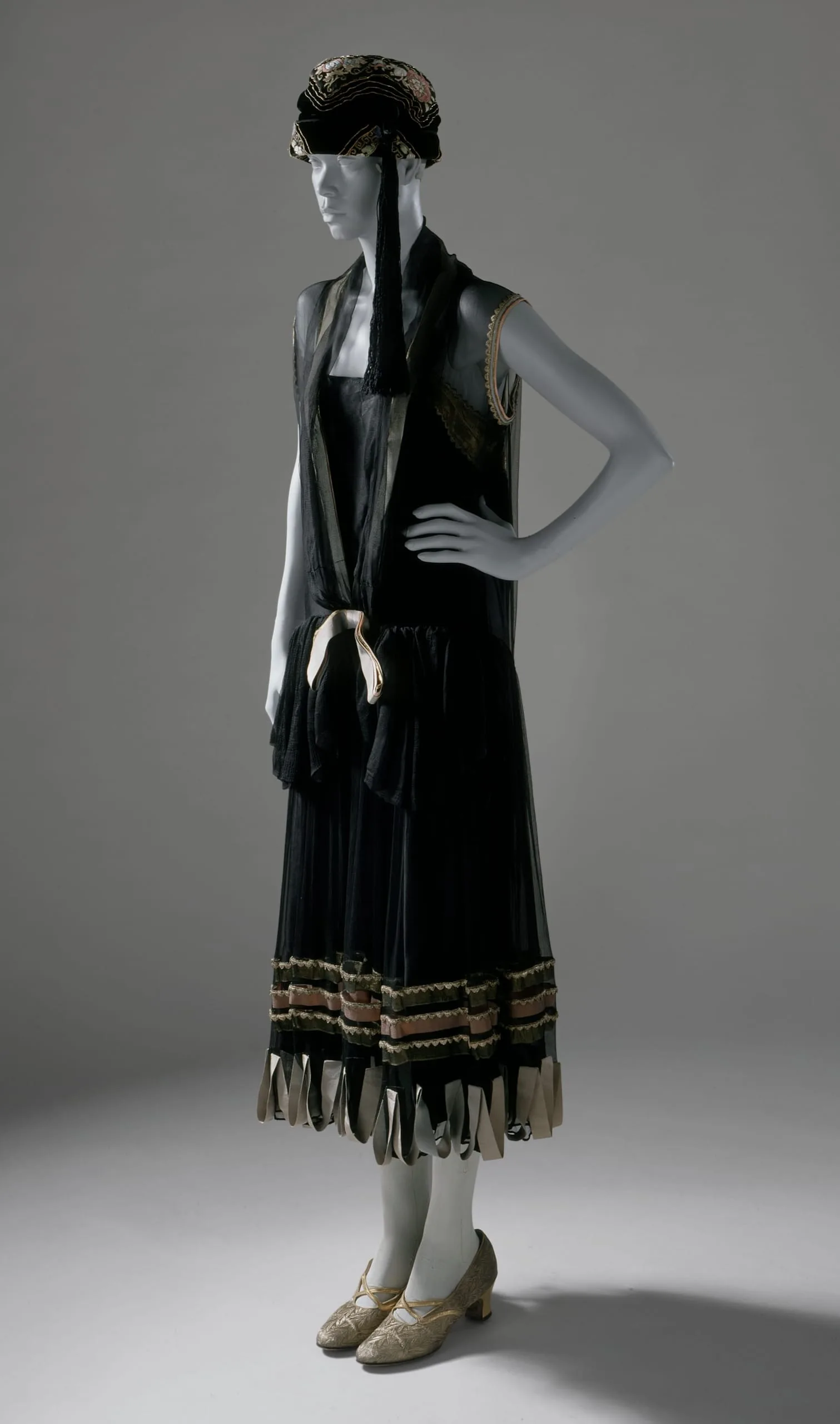 - Dress: silk plain weave (crepe chiffon) with silk and metallic-thread plain weave (lamé) ribbon, silk grosgrain ribbon, and metallic-thread passementerie; Underdress: silk satin with silk and metallic-thread plain weave (lamé) ribbon, silk grosgrain ribbon, and metallic-thread passementerie