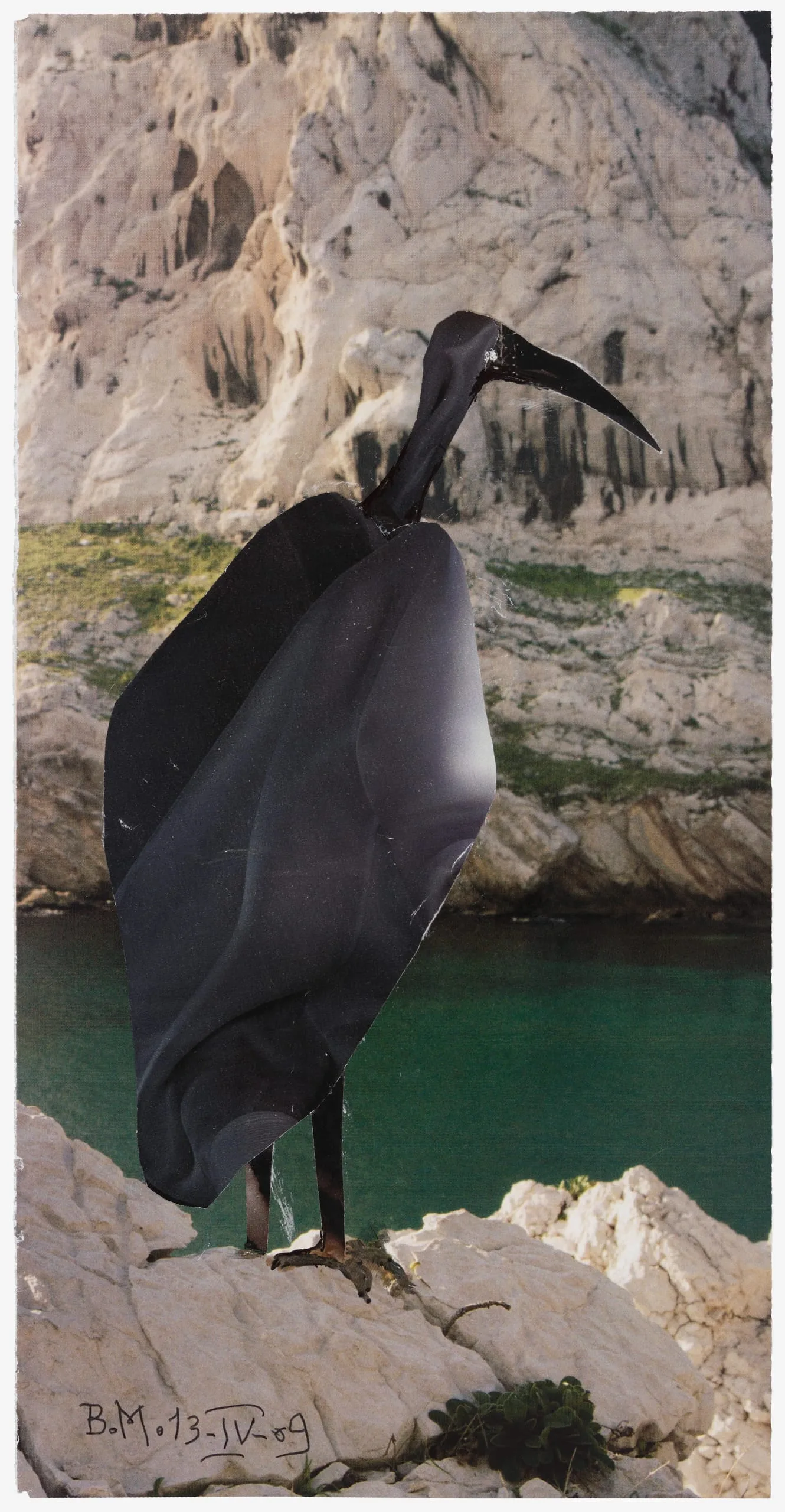 For decades, birds constituted a common theme in the work of Mohassess, who depicted similar types of fowls in familiar positions across various media. Here, he returns to the subject with a cut-out of a black bird that stands looming over an arid landscape and green body of water. The bird’s long torso and pointed, almost sickle-like beak, as well as the metallic sheen of its coloring, are reminiscent of the artist’s better-known bronze sculptures of birds, only a few of which have survived.