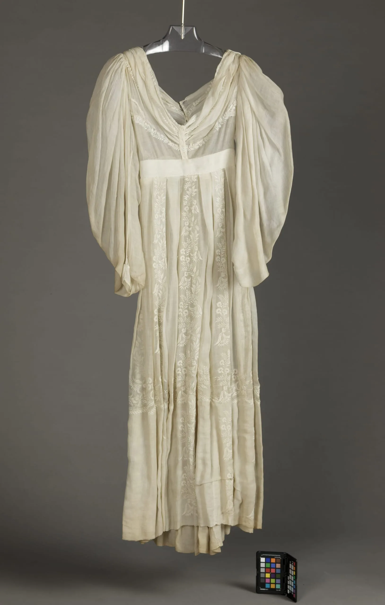 Full-length cream-white dress with voluminous puffed sleeves, empire waist, and white-on-white floral embroidery on skirt panels, displayed on a hanger