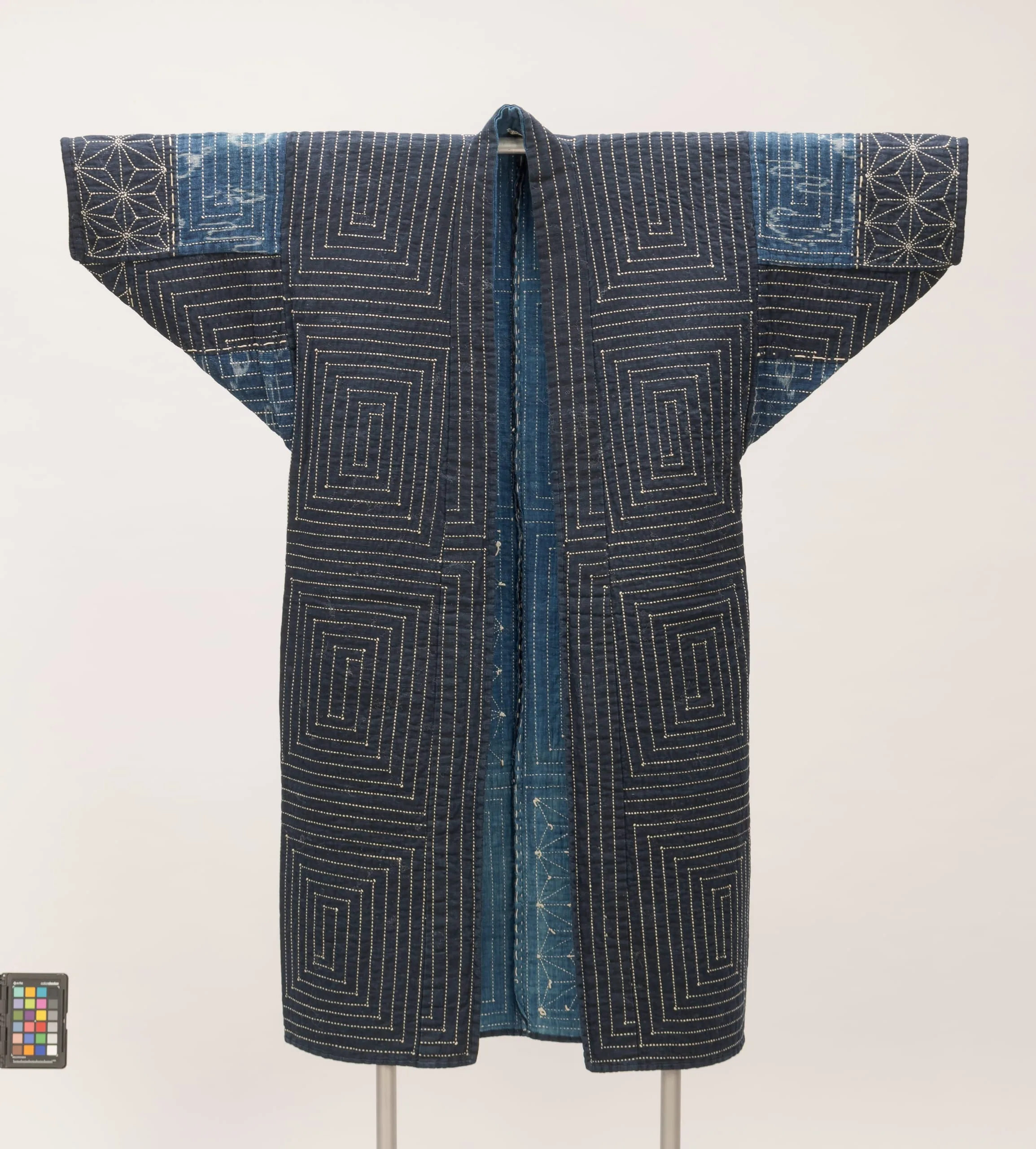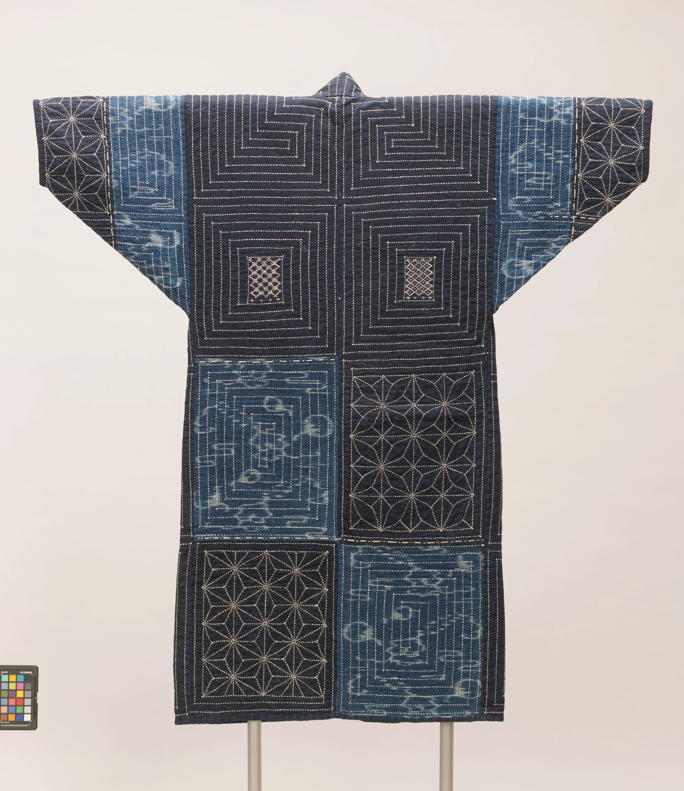 - Cotton plain weave, tie-resist-dyed warp and weft ikat (kasuri), patched and quilted, with cotton embroidery (sashiko)