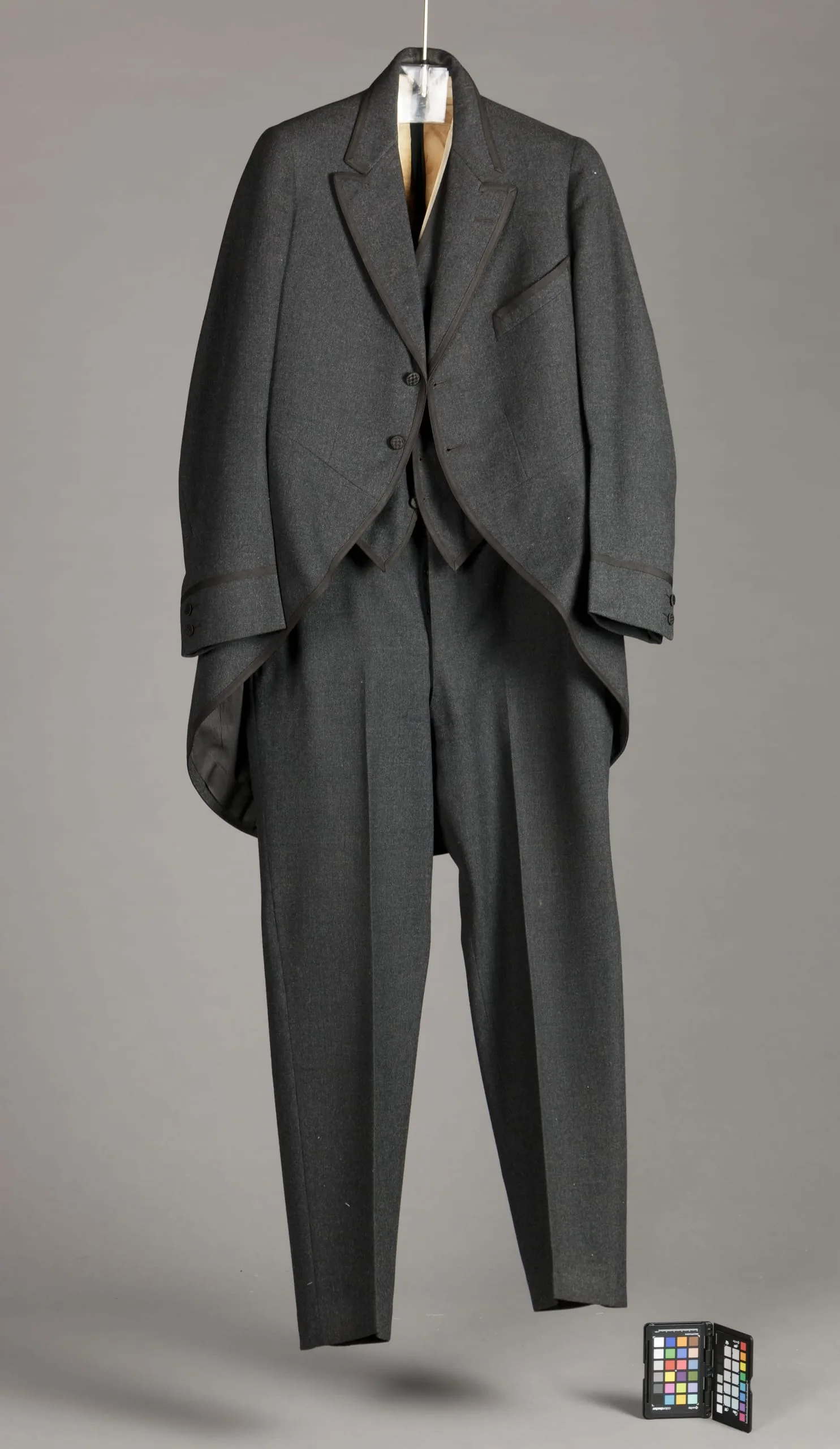 - Coat: Wool twill, with silk braid trim, and silk thread covered buttons. Trousers: Wool twill. Vest: Wool twill, with silk braid trim, and silk thread covered buttons.