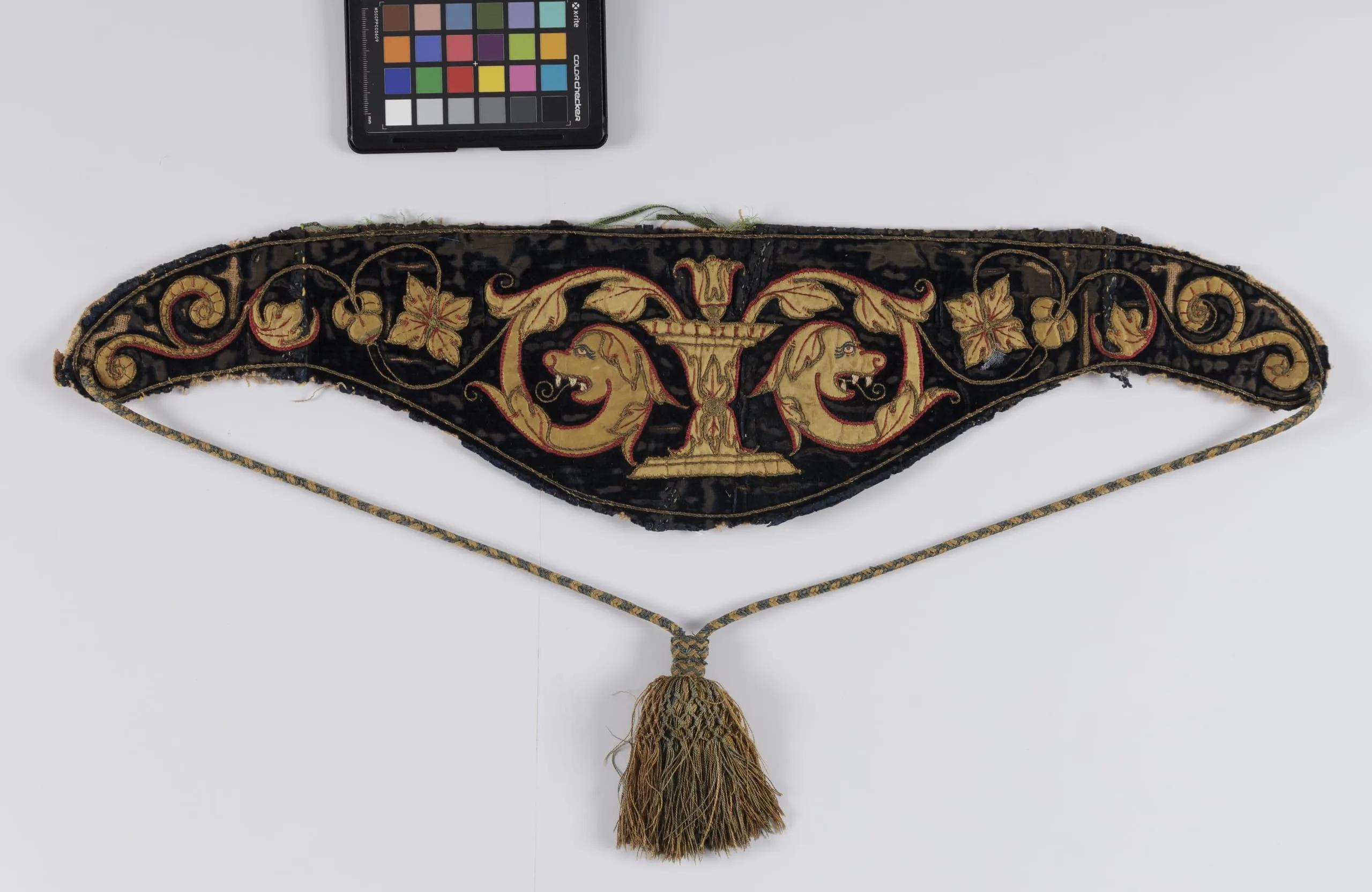 - Silk velvet with silk satin appliques, silk and metallic-thread embroidery, and silk cord and tassels