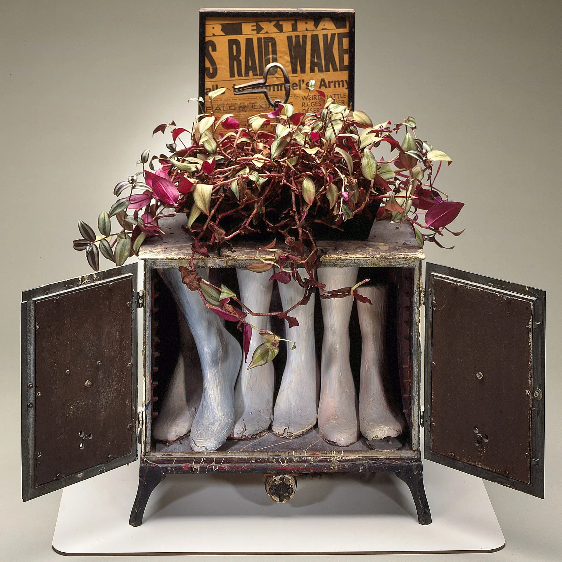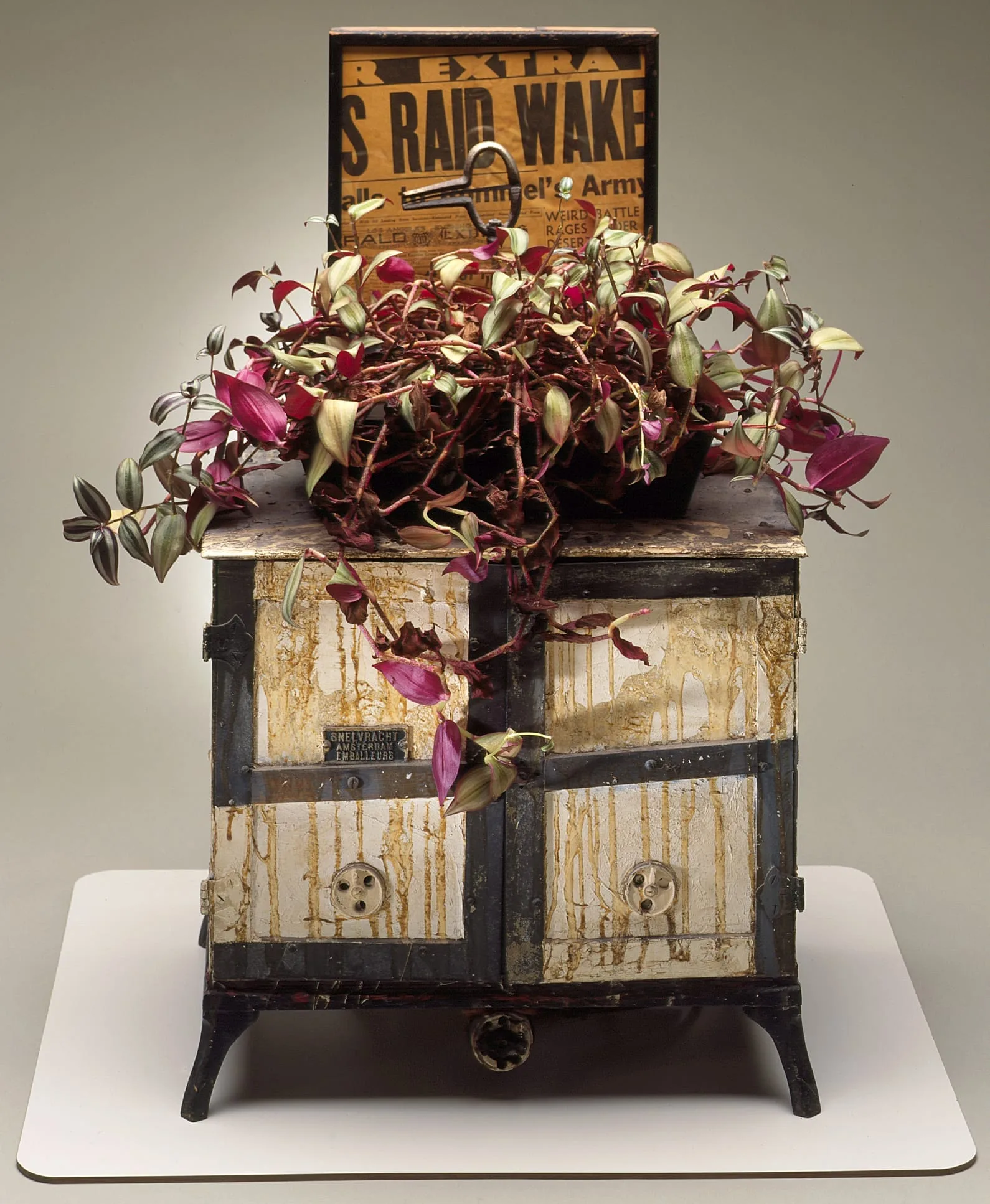 - Wood, metal, paper, paint, soil, plant (Wandering Jew), and aluminum container
