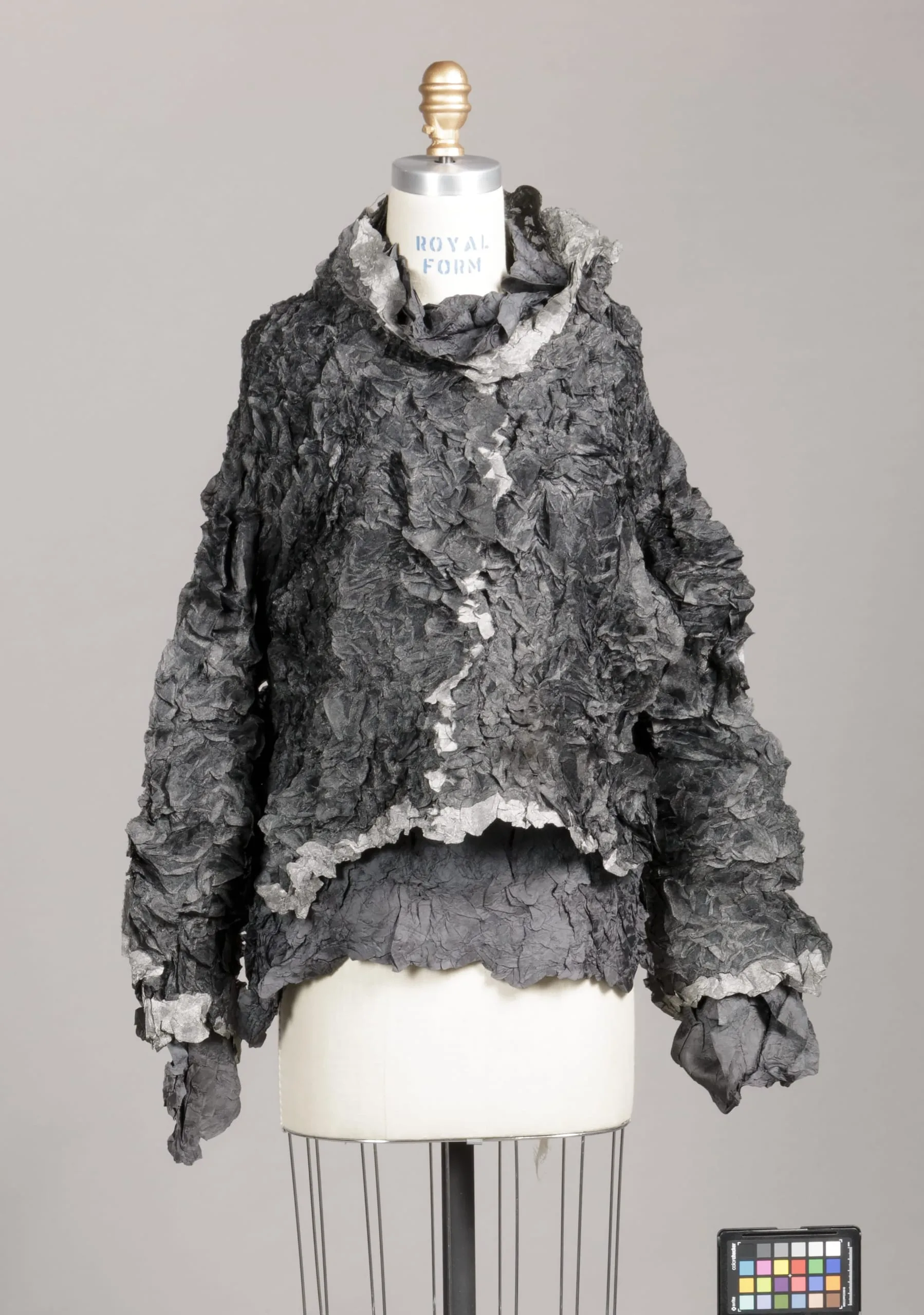 Charcoal gray jacket with heavily crinkled, sculptural texture and silver-white edges, displayed on a white dressmaker's form