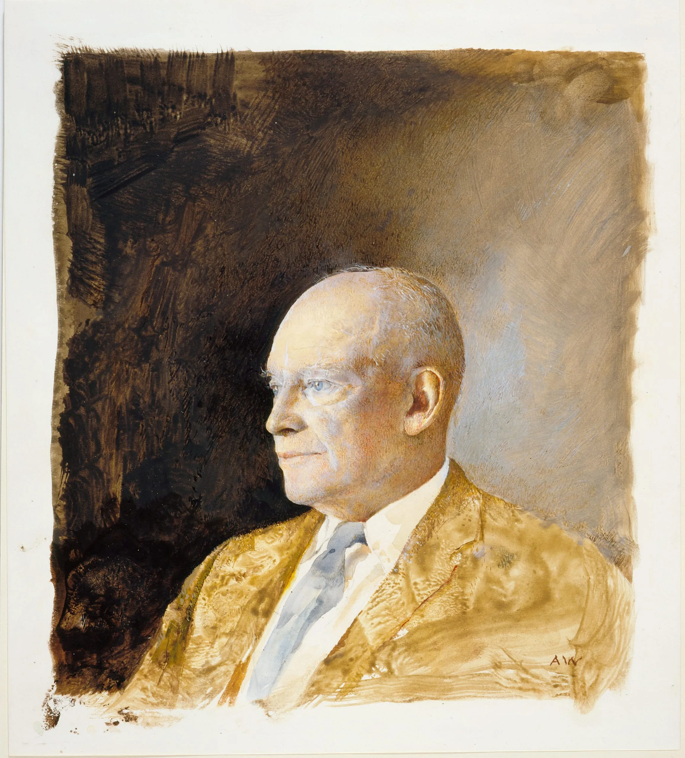 Wyeth has always been reluctant to accept commissions, and his most famous portraits are of his friends and neighbors. Nevertheless, he accepted the commission to paint the portrait of President Eisenhower for the cover illustration of the September 7, 1959, issue of Time magazine. Eisenhower sat for the portrait at his home in Gettysburg, Pennsylvania, for short periods over the course of five days in August 1959. In characteristic fashion Wyeth asked his sitter to wear his favorite clothes-Eisenhower chose a straw-colored, nubby silk jacket -- and placed him before an empty background. Wyeth presented the president as a strong-minded individual with the quiet strength of a dedicated public servant. These characteristics are similarly captured in Wyeth’s The Patriot, 1964 (private collection), a bust portrait of an elderly soldier.