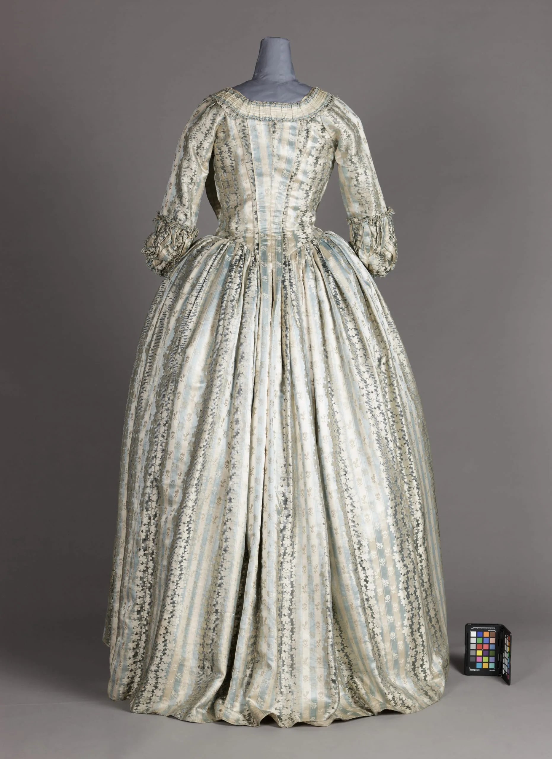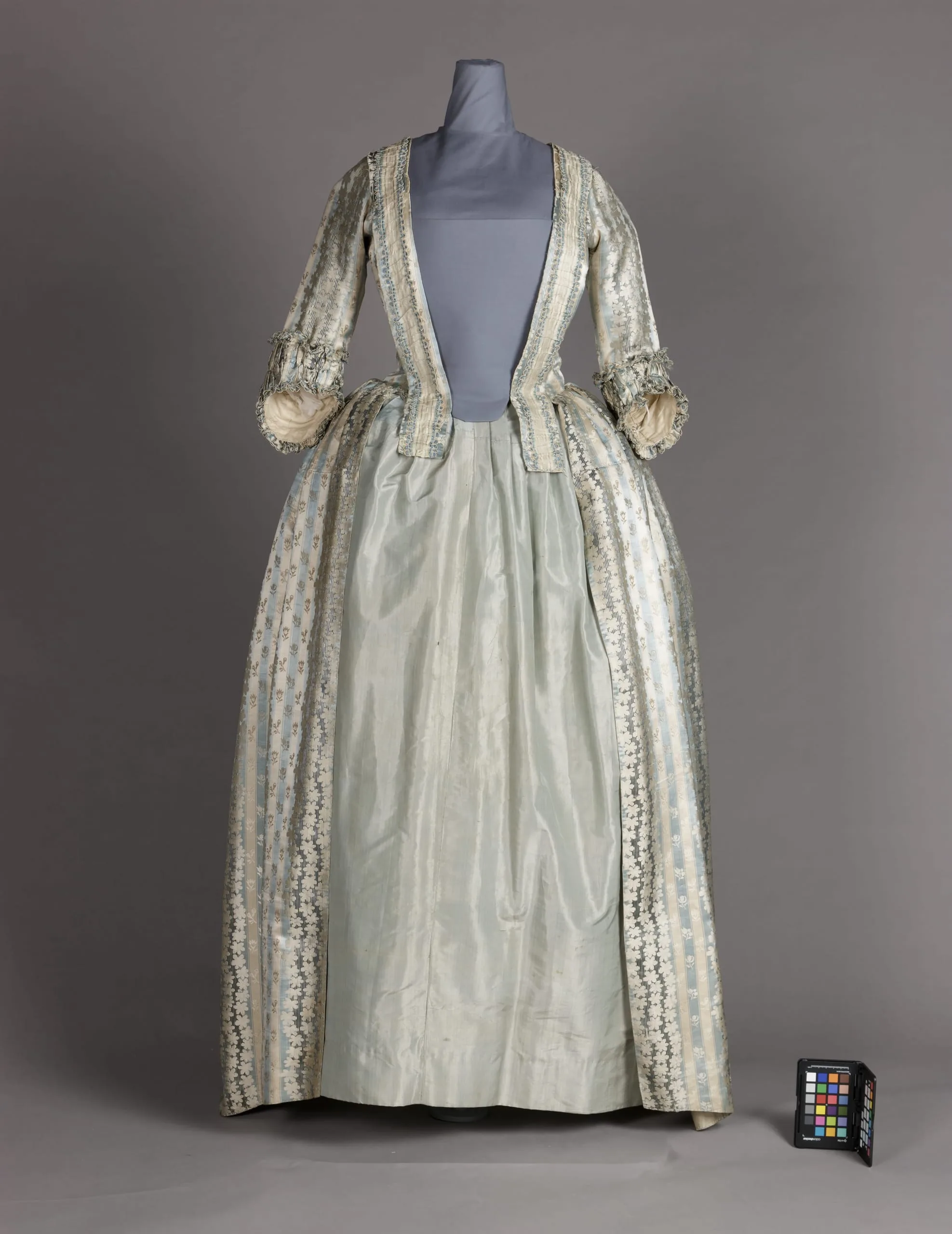 - Robe: silk satin with silk supplementary-weft patterning and silk passementerie; Petticoat: silk plain weave (taffeta)