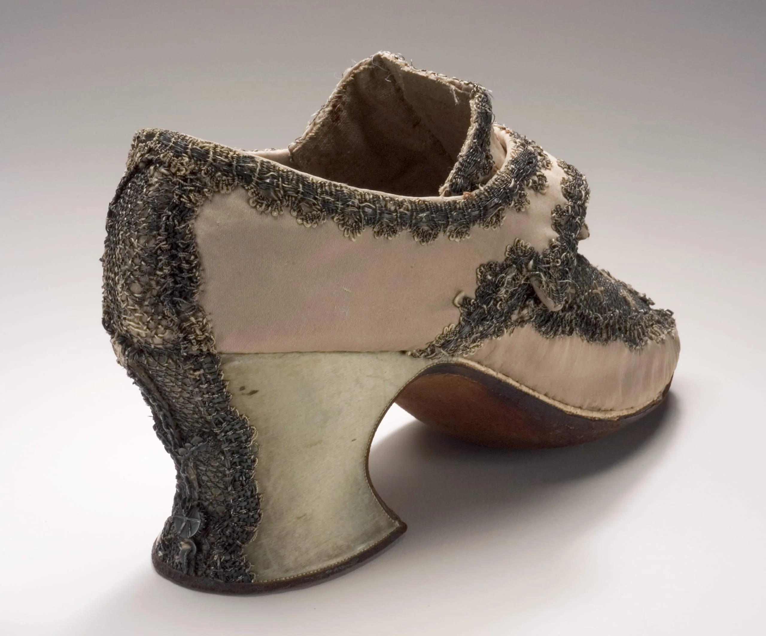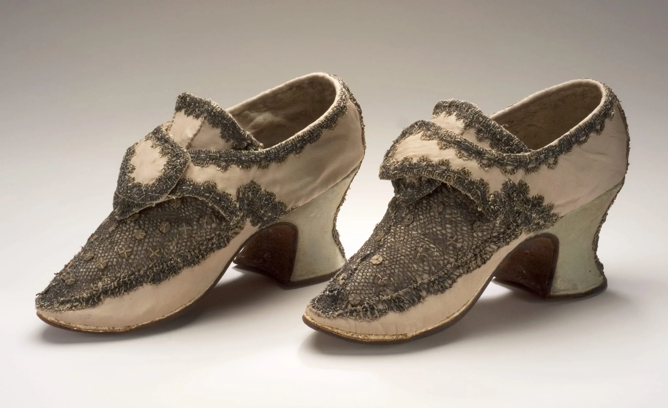 - Silk satin, silver lace, metal sequins, and leather