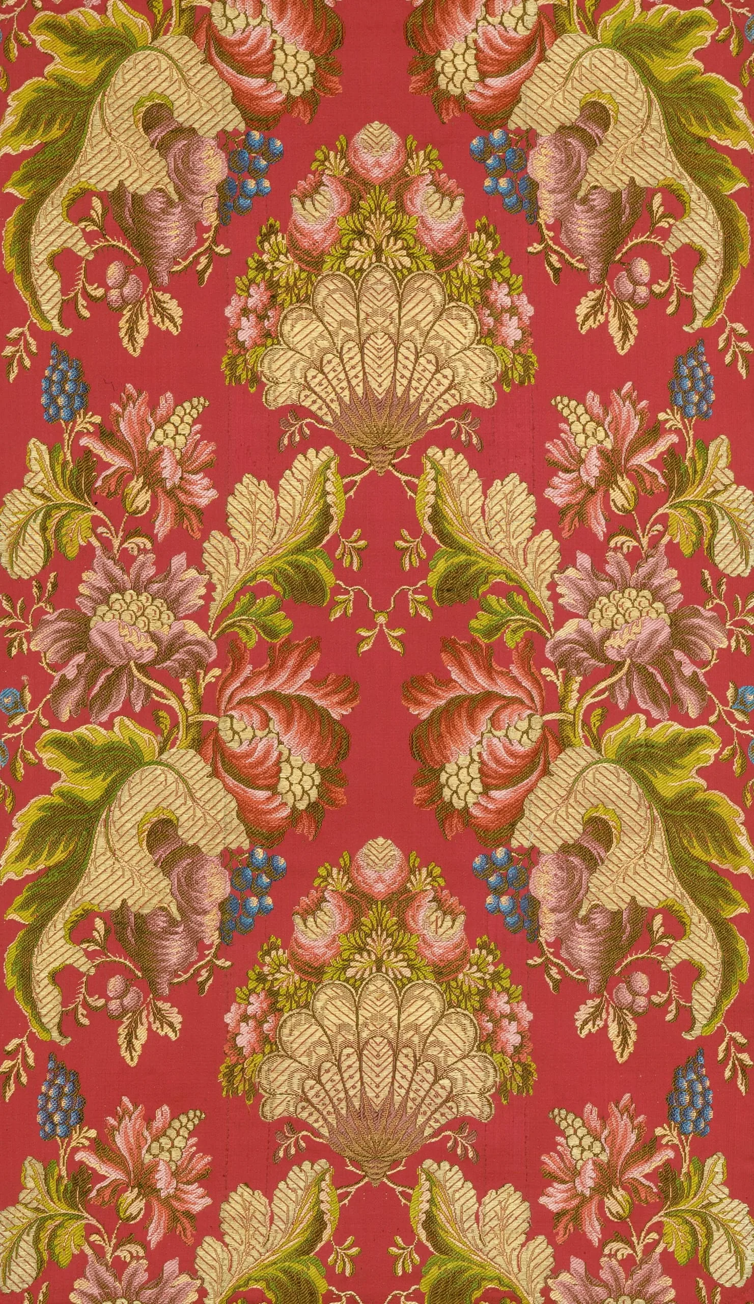- Silk satin with silk weft patterning and silk and metallic thread discontinuous supplmentary-weft patterning (brocade)