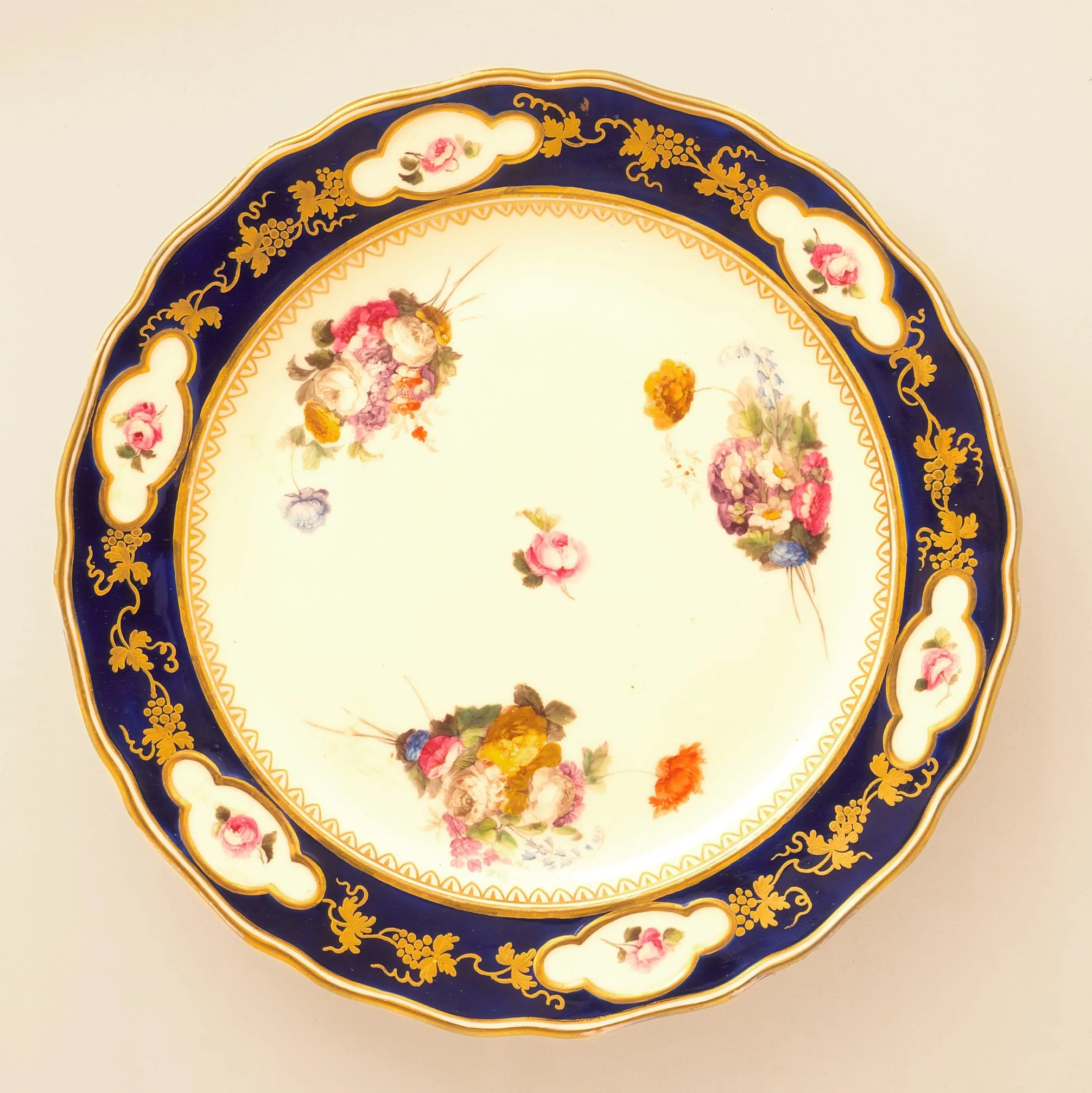 Ceramic plate with cobalt blue and gilt border, cream well painted with scattered polychrome floral bouquets in pink, yellow, and white, scalloped rim