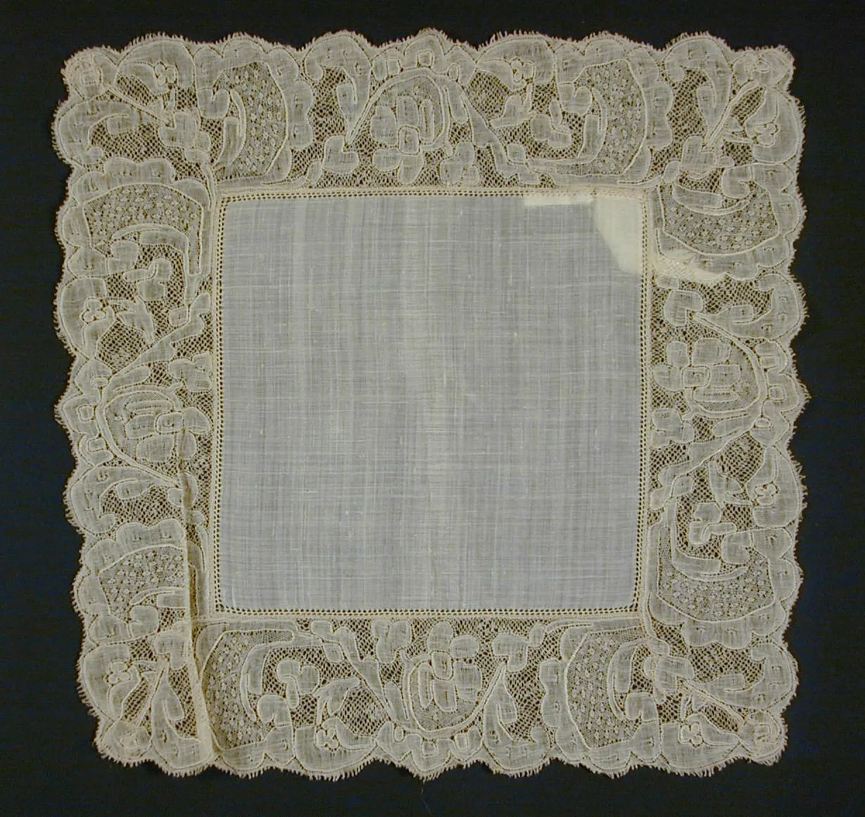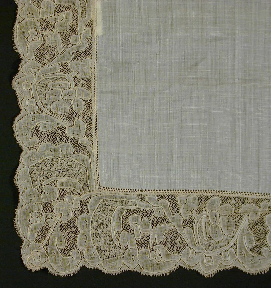 Linen handkerchief with wide bobbin lace border featuring raised floral and scrolling motifs on a fine mesh ground, scalloped outer edge, cream colored.