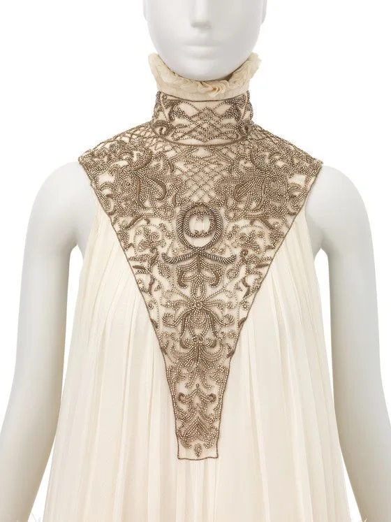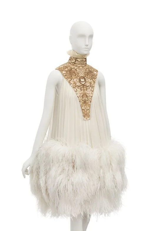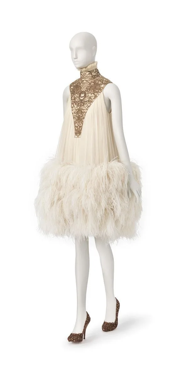 - Silk plain weave (chiffon) with feathers, silk net, glass beads, crystals, and metallic-thread braid