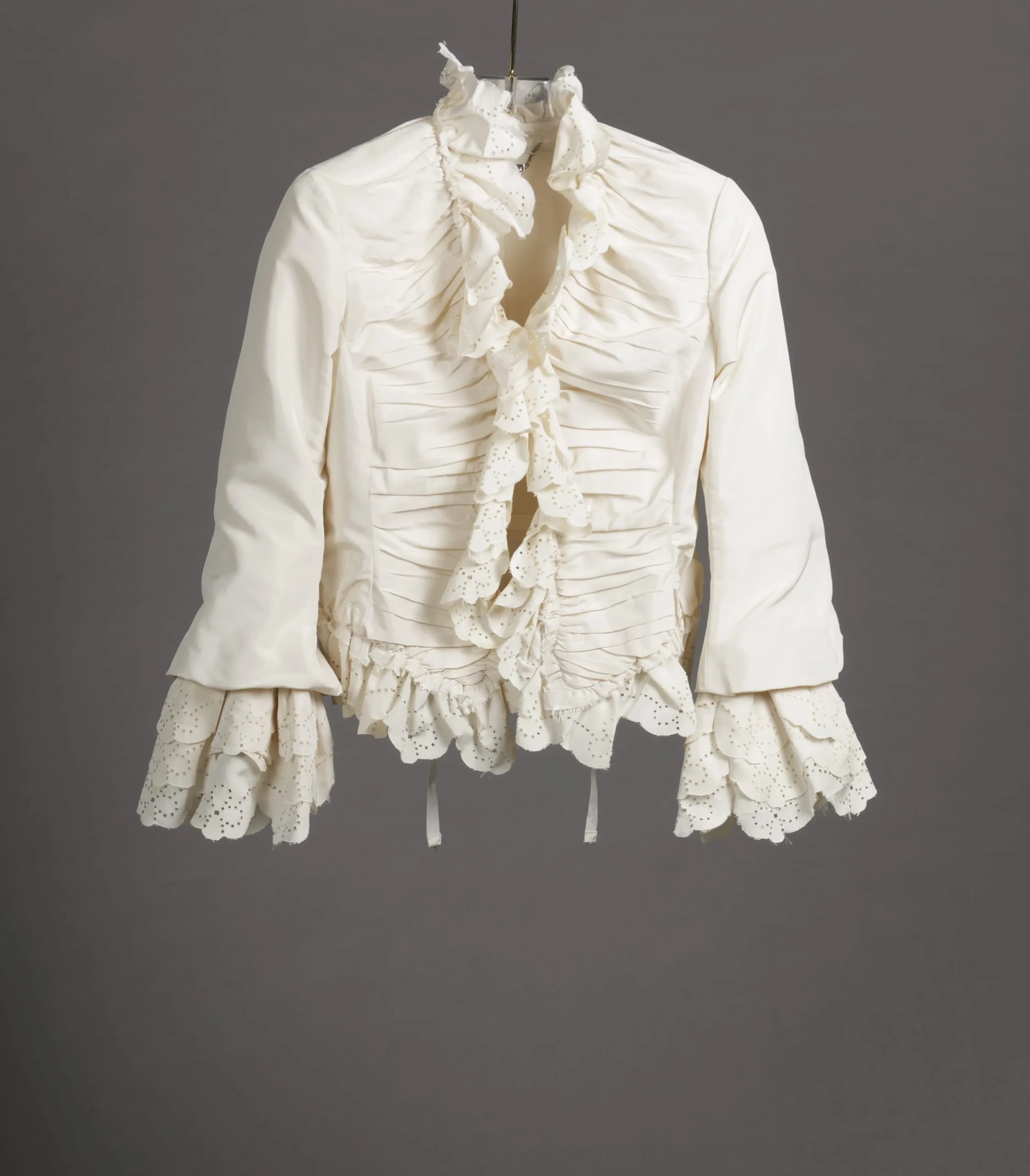 - Jacket: Silk plain weave (faille); Belt: Snakeskin leather, metal