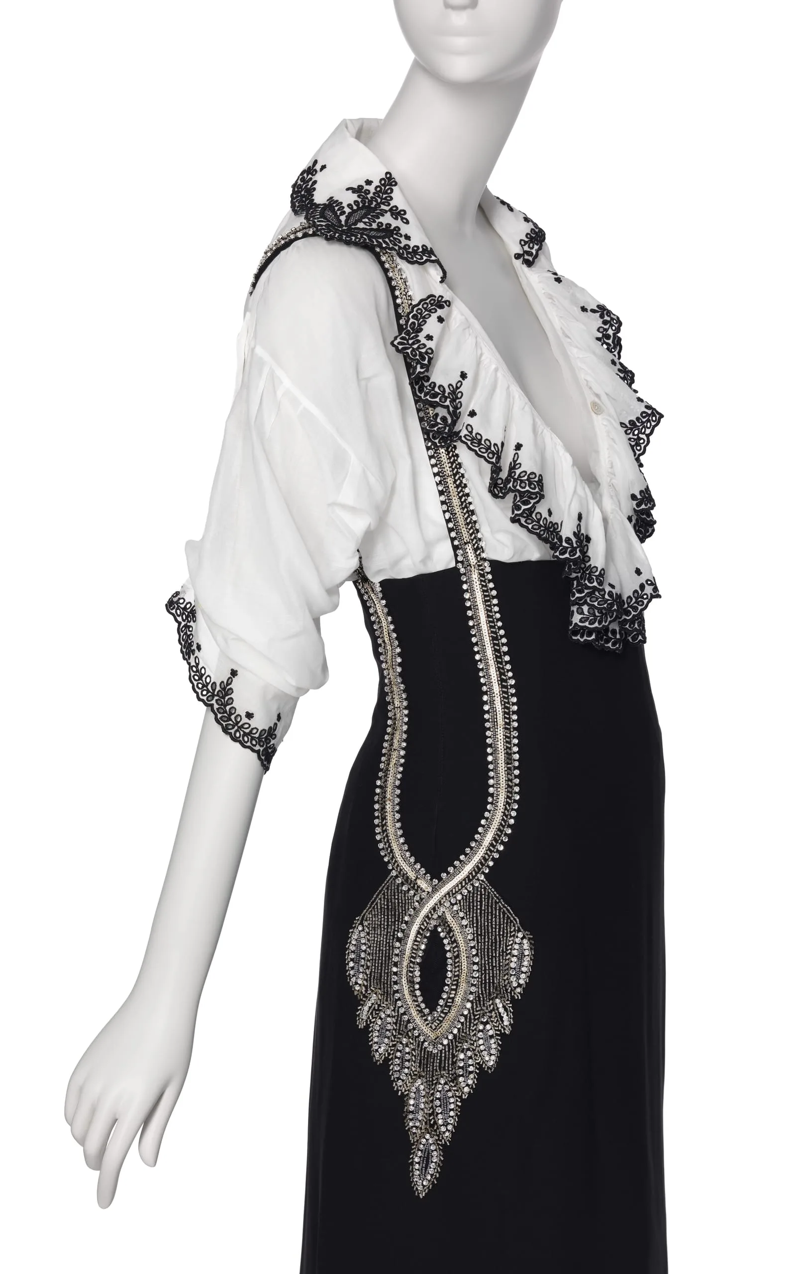 Skirt: Silk plain weave (crepe), with silk net, glass beads, crystals, and metal sequins