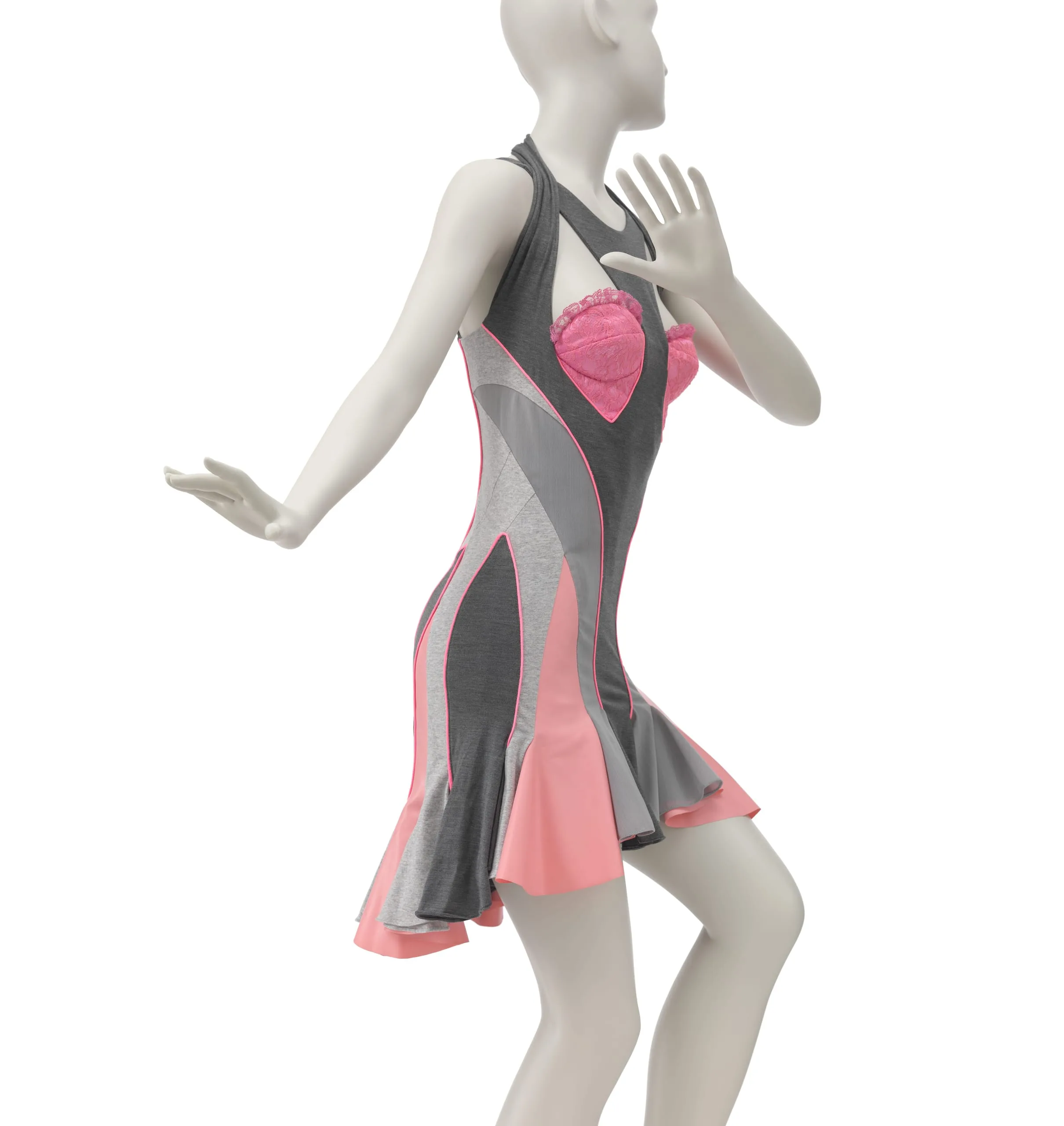 - Cotton knit (jersey), rayon/elastane knit (jersey), nylon/elastane net, rubber, silk satin, nylon lace, and polyurethane plain weave