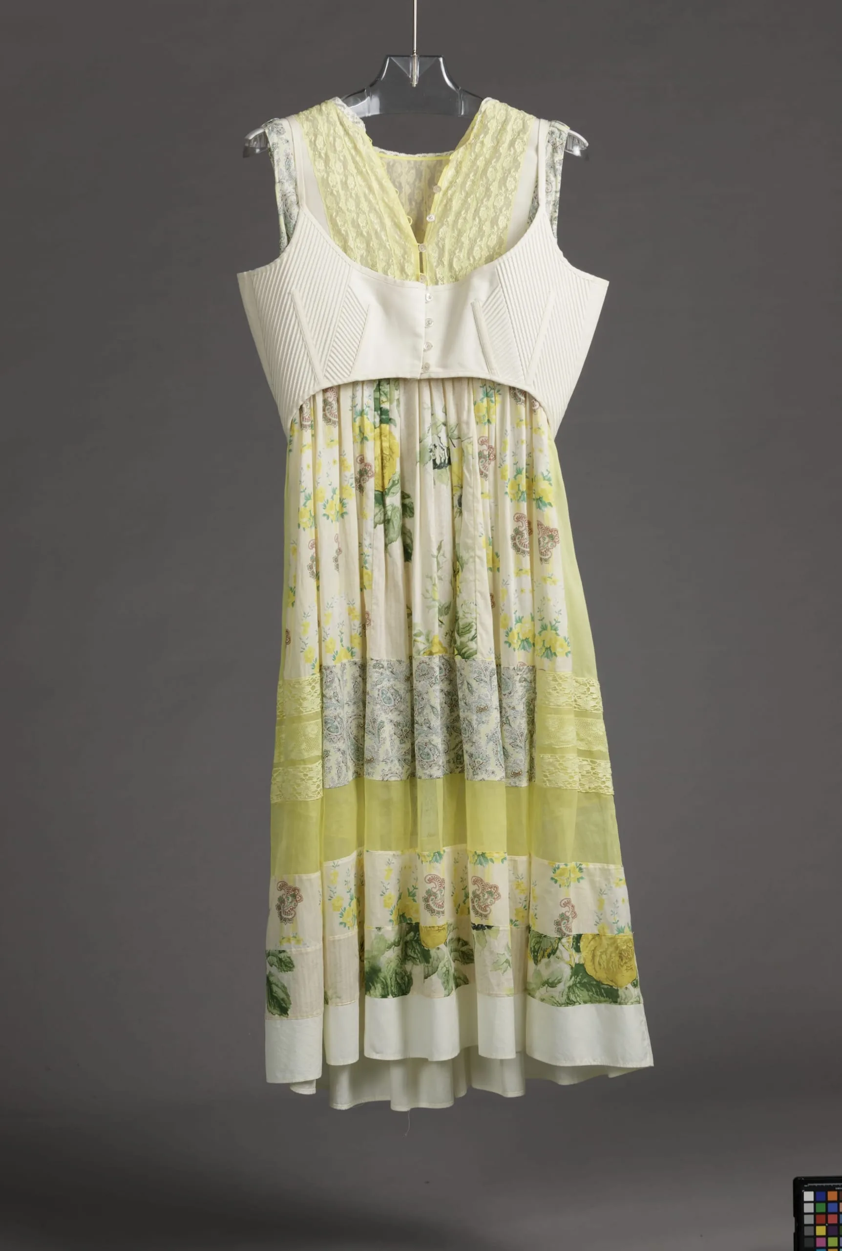 - a) Dress: Cotton plain weave (voile), printed, cotton plain weave (organdy), and cotton lace, pieced, with cotton embroidery, shell buttons, and silk grosgrain trim; b) Corset: Cotton sateen, quilted, with cotton twill tape, shell buttons, metal D-rings, and silk satin ribbon