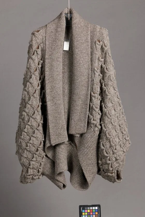 Knitted taupe-gray cardigan with voluminous sleeves covered in raised loop texture, open-front shawl collar, and draped asymmetrical hem, suspended on a hanger