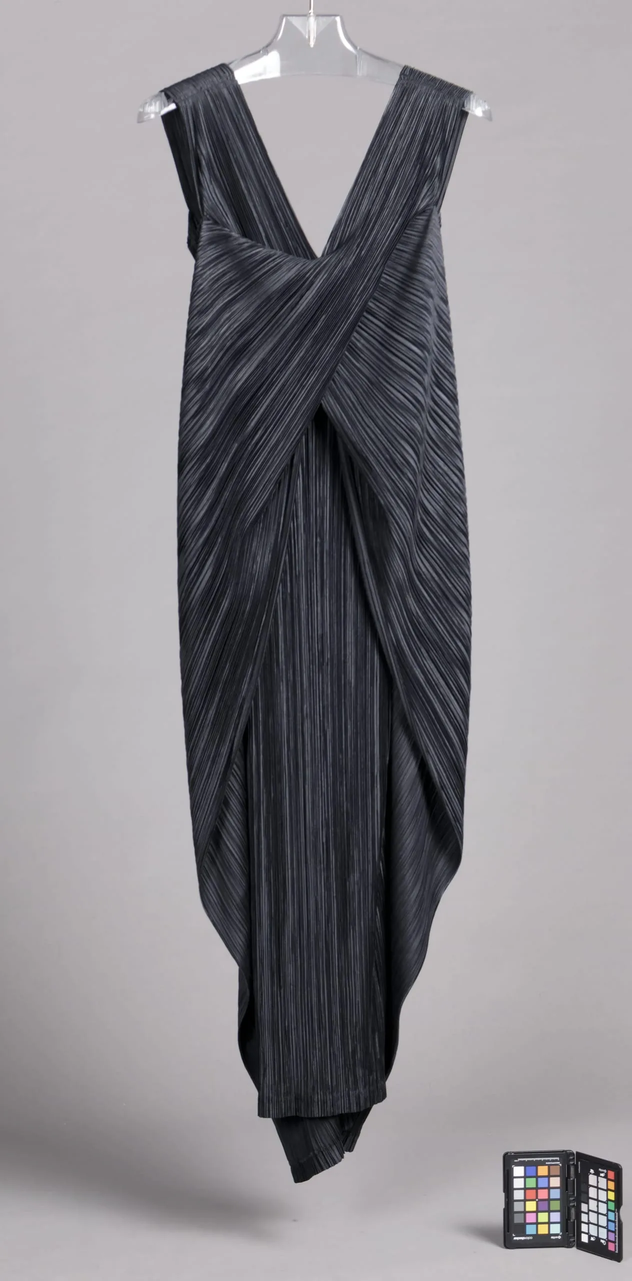 Sleeveless pleated charcoal gray dress on a clear hanger, with crossing panels at the chest forming a deep V-neck and radiating pleats that taper to a draped, tulip-shaped hem
