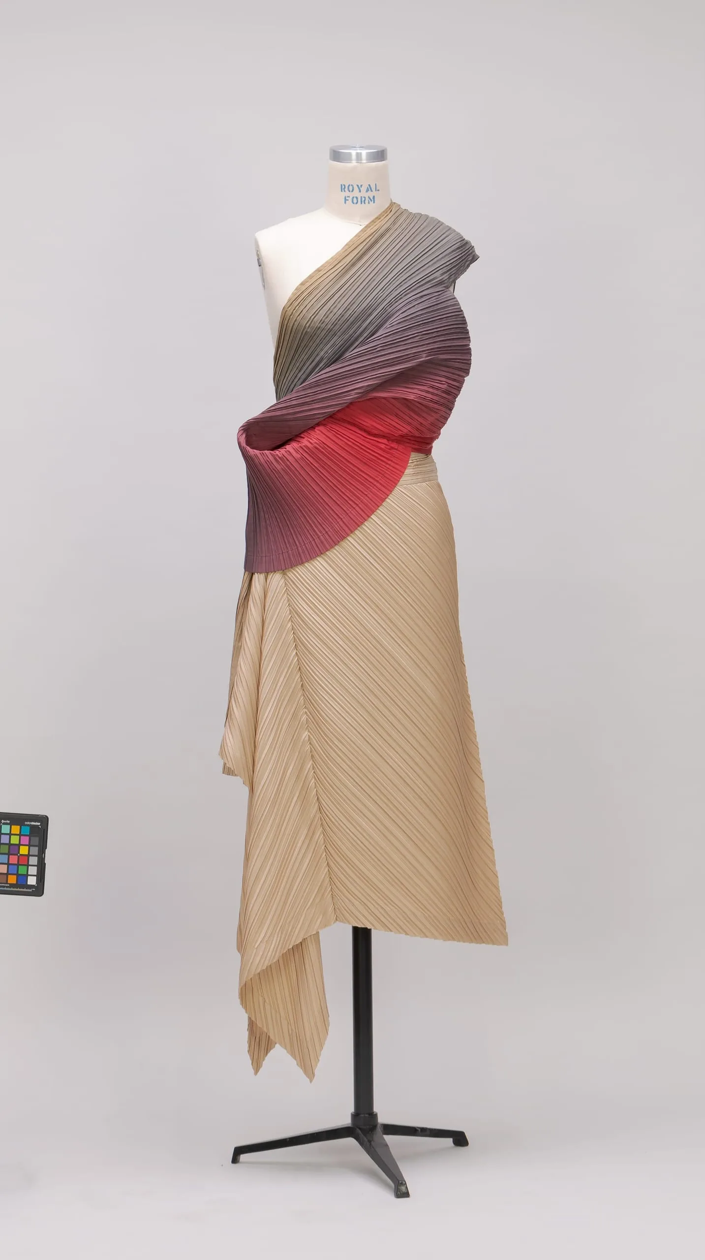 - Blouse and Skirt: Cotton/polyester plain weave, heat-set pleated