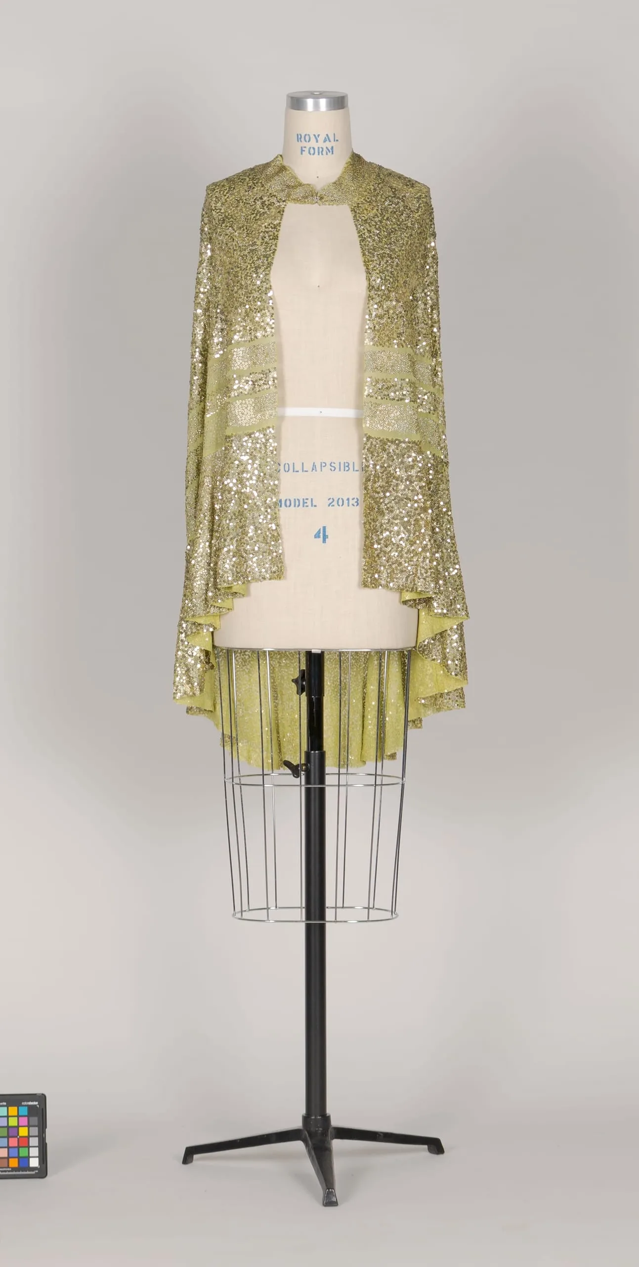 Chartreuse-yellow sequined evening wrap with sheer horizontal bands displayed on a white dressmaker's dummy with a wire cage base