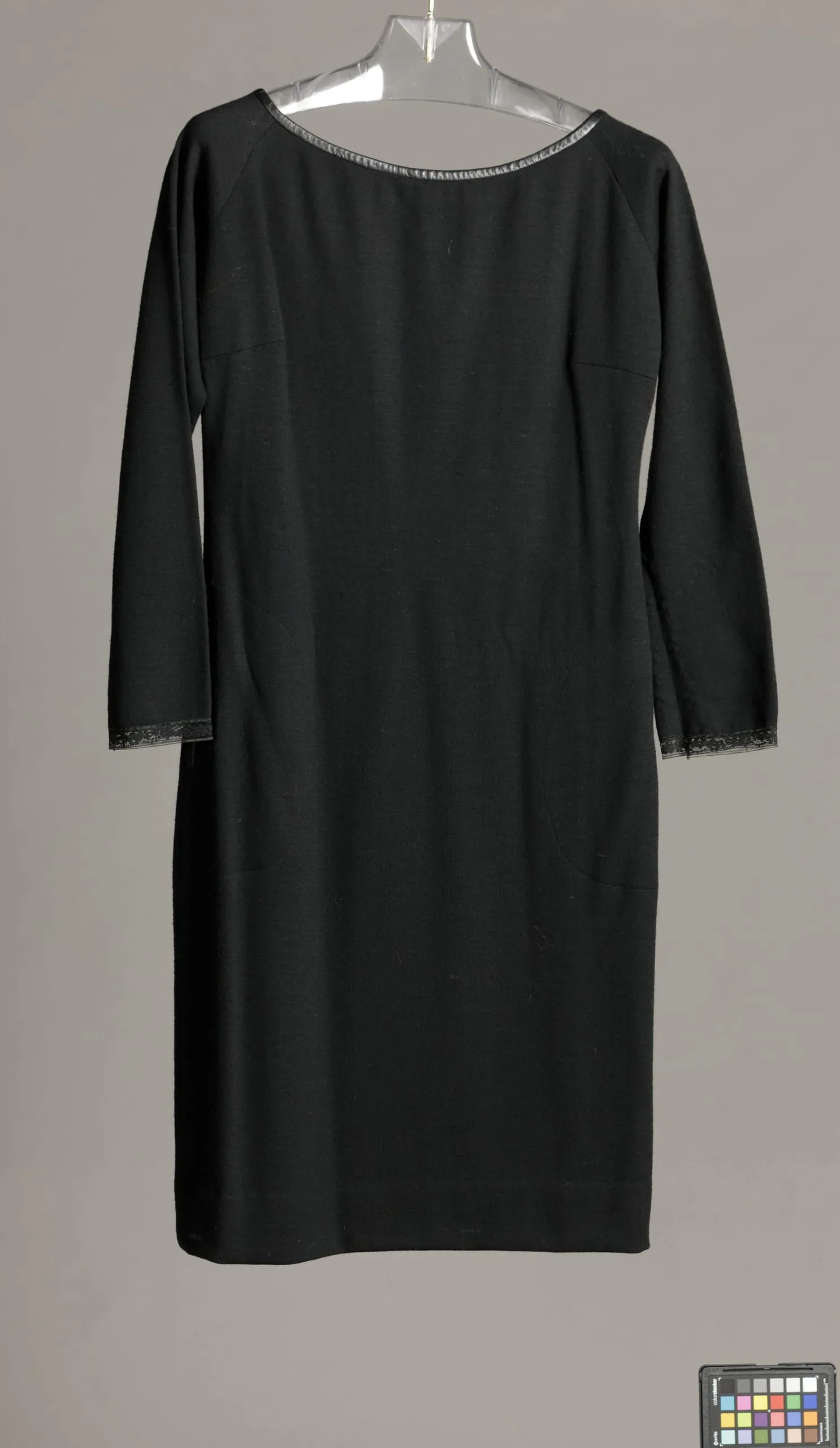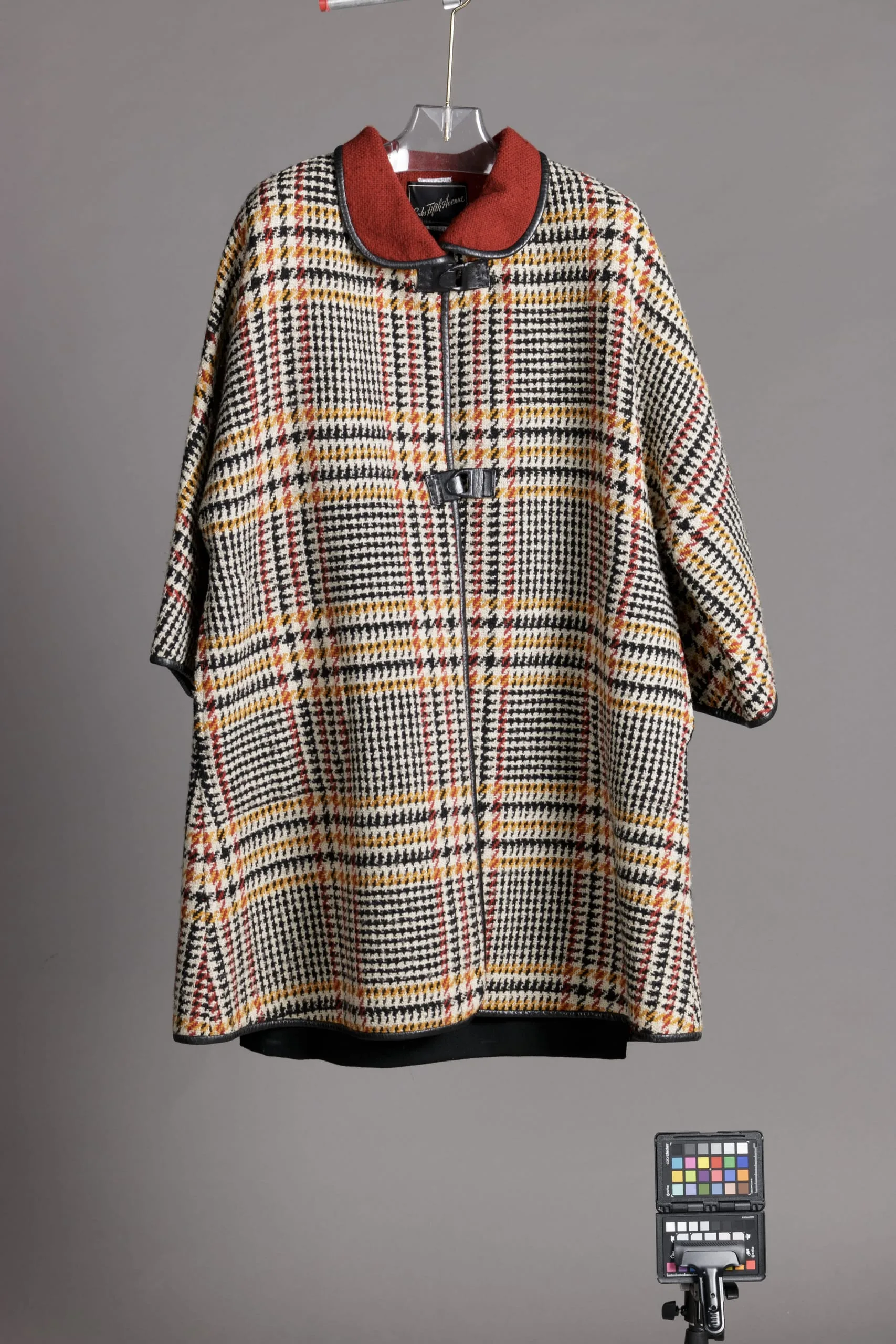 - Coat: Wool twill and basket weave with leather trim and clasp; Dress: Wool knit with leather trim