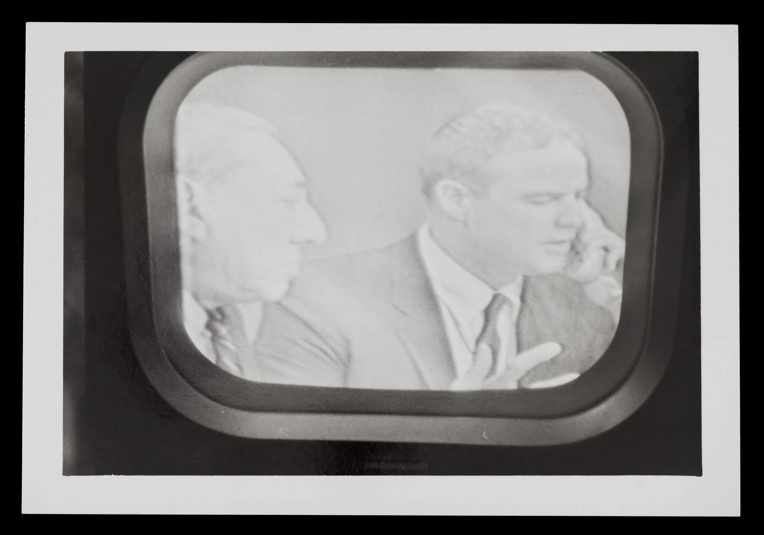 Black and white photograph of a vintage television screen showing two men in suits and ties, facing left in profile, one gesturing with his hand